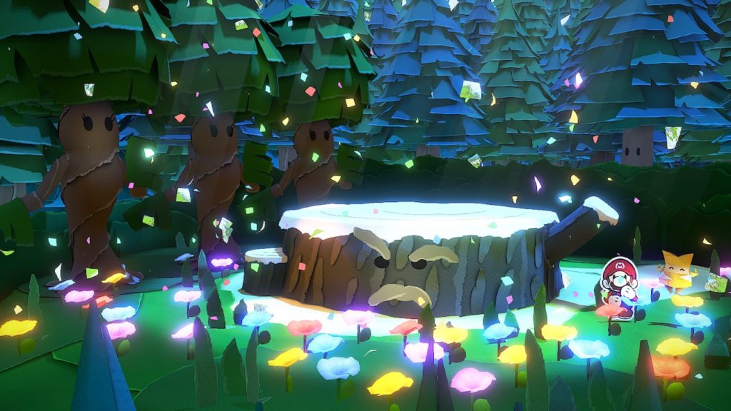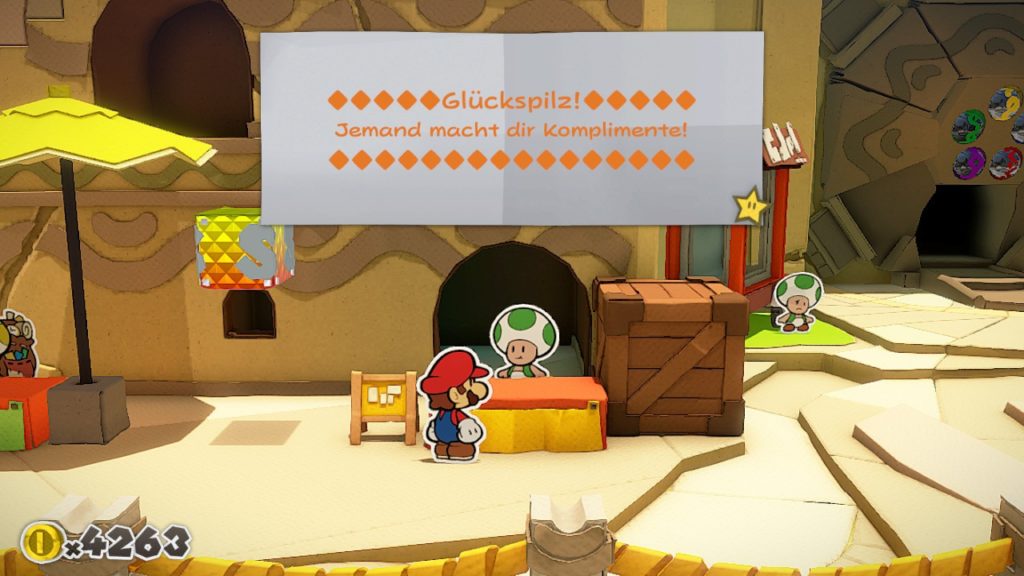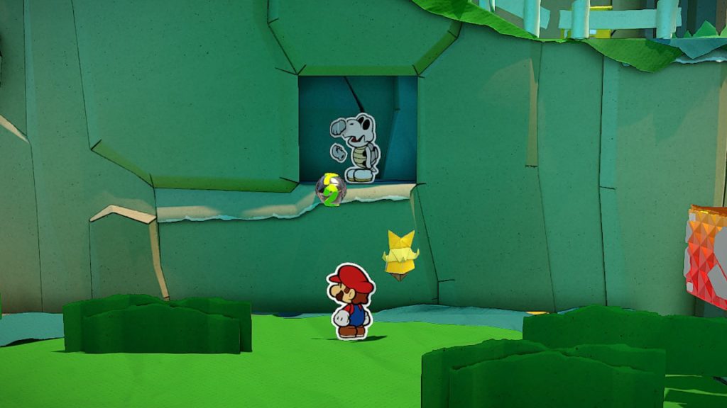 Zusätzlich sind die „?-Blöcke“ nun relativ selten, was einen Überraschungsmoment auslöst und diese tragen auch zu der Sammelstatistik bei. Dazu gibt es sogenannte Mini-Trophäen, die man in Schatzkisten findet. Später kann man diese im Museum besichtigen. Überall auf der Spielwelt lässt sich erkennen, was die bösen Origami-Schergen anrichten. Diese falten alles zusammen und damit auch die Toads. Diese gilt es zu retten. Es lohnt sich die Spielwelt detailliert zu untersuchen, um die Toads zu finden. Das macht Spaß, da diese immer etwas erzählen und sie nicht alle nach dem gleichen Schema versteckt sind.