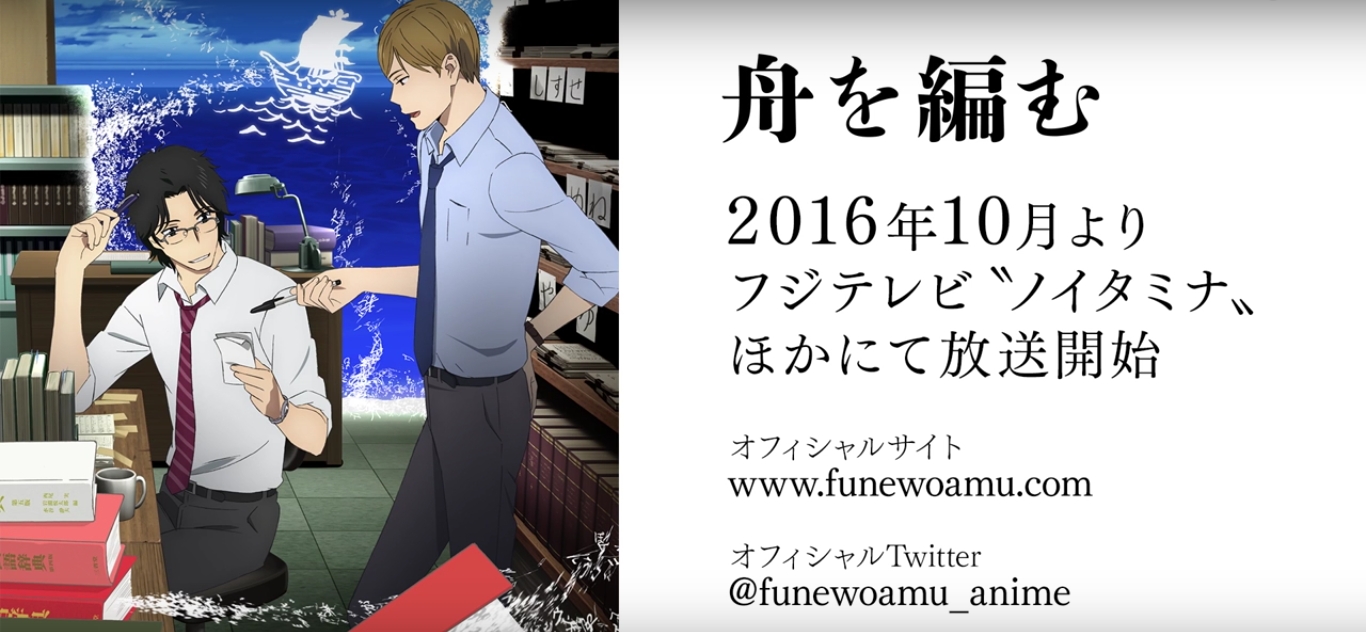 Der Roman Fune wo Amu (The Great Passage) von Shion Miura wird als Anime umgesetzt. Das berichtet Fuji TV in einem Live Stream Event. Starten soll der Anime zu Fune wo Amuim Oktober im Noitamina Block auf Fuji TV. Es gibt auch schon einen ersten Teaser und ein Poster.
