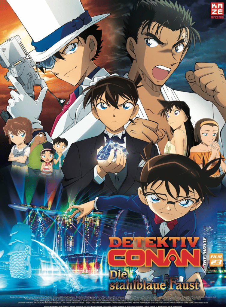 Ran, Sonoko und Kogorô reisen nach Singapur, um Karate-Champion Makoto Kyôgoku bei einem wichtigen Turnier anzufeuern. Conan würde gerne mitfliegen, kann jedoch keine gültigen Reisedokumente vorweisen. Umso erstaunter ist er, als er plötzlich in einem präparierten Koffer zu sich kommt – und das mitten in Singapur! Kurz darauf wird klar: Niemand Geringeres als Kaitô Kid hat ihn ins Land geschmuggelt – natürlich nicht ohne Hintergedanken. Während sich der Meisterdieb als Shin’ichi ausgibt und Conan eine neue Identität annehmen muss, wartet ein neuer Fall bereits darauf, gelöst zu werden: Die Rechtsanwältin Sherilyn Tan wurde im berühmtesten Hotel Singapurs ermordet, kurz darauf explodierte ihr Auto in der Tiefgarage. Doch warum wurde am Tatort Kaitô Kids Visitenkarte gefunden? Und was hat der Mord mit dem Karateturnier zu tun, bei dem der Sieger einen wertvollen Saphir – die „Stahlblaue Faust“ – gewinnen kann?