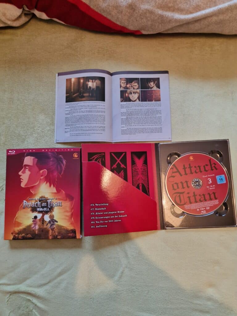 Wie ihr es bereits kennt: Die physische Umsetzung des Produkts ist natürlich wieder kein wertungsrelevanter Punkt unserer Kritik, soll euch aber ein Bild von dem vermitteln, was ihr als Käufer erwarten könnt. Die folgende Beschreibung und die Bilder beziehen sich dabei auf die Blu-Ray-Version des dritten Volumes von „Attack on Titan Final Season“.