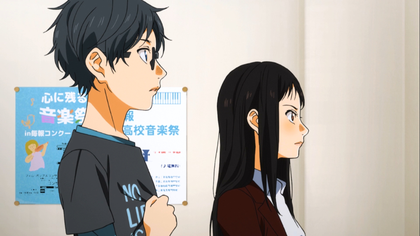 Kousei und sein Auftritt sind dann hier das Gegenteil, denn wie wir es schon kennen, versinkt er hier auch wieder in das tiefschwarze Loch und fühlt sich als ob er im Wasser wär und würde ertrinken. Doch dieses mal gibt es auch die Mutter. Es ist der Höhepunkt seiner Katharsis und am Ende steht die Befreiung. Danach wirkt sein Spiel wie der Frühling, genauer gesagt der April wenn die Kirschblüten fallen.