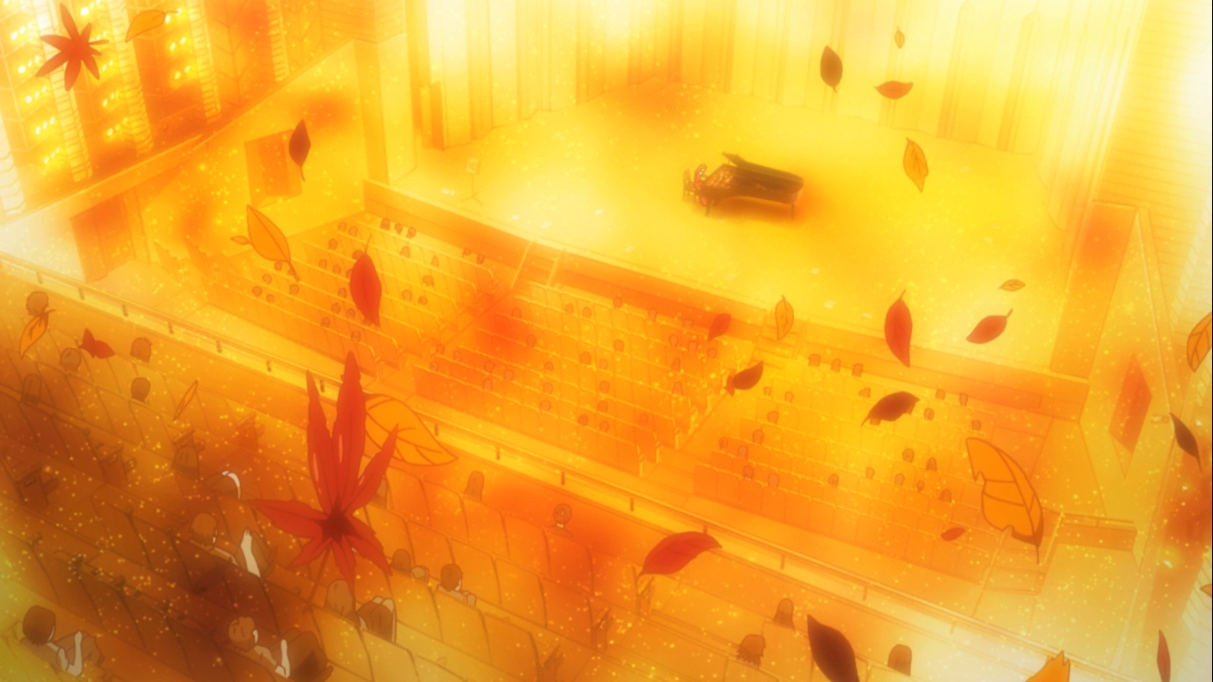 Kommen wir nochmal auf die Szene von Emi und ihren Auftritt zurück. Hier zeigen sich die stärken des Animes sehr deutlich. Denn ihre Art zu spielen ist eine andere, als man sie vorher in Shigatsu Wa Kimi No Uso – Sekunden in Moll sah. Das wird auch beiden Bildern deutlich, je länger sie am Piano ihr Stück vorführt. Desto klarer wird es auch für den Zuschauer. Das Bild nimmt die Färbung von Rot und Gelb ein, welches genau ihre Emotionen wiederspiegelt. Dazu fällt auch Laub und alles wirkt wie der Herbst.