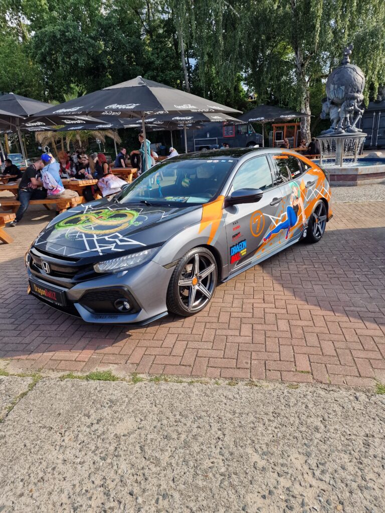 Die Anime Messe Babelsberg wartete wieder mit vielen Highlights auf. Wie das Jahr zuvor war der gesamte Filmpark ebenfalls mit dem Ticket besuchbar und viele Stationen der Messe waren über den gesamten Filmpark verteilt. Am Eingang gab es nach letztjähriger Pause wieder die Metropolishalle. Letztes Jahr wurde diese als Unterkunft für Kriegsflüchtlinge aus der Ukraine benutzt, doch dieses Jahr stand sie wieder komplett zur Verfügung. Wie gewohnt waren alle kommerziellen Händler dort und man konnte alles kaufen, was das Otakuherz begehrt. Weiterhin waren einige der Künstler:innen auch dort. Ein Großteil wurde jedoch in die Caligarihalle am Ende des Filmparks outgesourct, um die beiden Bereiche etwas zu entzerren. Zudem war der große Festsaal in der Metropolishalle wieder verfügbar, der für diverse Events genutzt wurde wie Konzerte, die J-Disco, für die ein DJ extra aus Japan anreiste, die Eröffnungsfeier und Panels. Durch einen Seiteneingang in der Halle kam man zudem zum Workshopraum, der ganztägig unterschiedliche Workshops anbot, wie Mangas zeichnen für Anfänger oder Fuchsmasken bemalen. Neben der Halle wurde natürlich als Hauptbühne für Konzerte die Vulkanarena genutzt, wo normalerweise die Stuntshow des Parks stattfindet. Es gab zudem noch im Park einen Workshopraum für TCGs (Sammelkartenspiele), wo das One Piece TCG dieses Mal im Mittelpunkt stand und Neulingen beigebracht wurde. Dazu fanden in der Gaming-Area auch Turniere statt, bei dem Frank im Halbfinale rausflog und mit vorgefertigten Demodecks gespielt wurde, damit es auch für Beginner gleiche Chancen gibt. In der Gaming-Area konnte man sich aber auch an anderen Games wie Dance Dance Revolution ausprobieren oder einfach Anime-Games wie Naruto oder Demon Slayer an aufgestellten Computern/Konsolen spielen. Es gab auch weitere Turniere dort wie Mario Kart, sodass es nicht langweilig wurde. Wer lieber passiv auf den Bildschirm schauen möchte, der hatte in zwei Anime-Kinos die Gelegenheit, Filme und Serien zu gucken, die dort ganztägig liefen. Außerdem war eine Schnitzeljagd mit über 100 Fragen aus den Bereichen Manga, Anime und Gaming über den gesamten Park verteilt, an der man nach Anmeldung teilnehmen konnte und auch ein Maid-Café durfte nicht fehlen. Die Autos mit Anime Motiven waren auch wieder da und konnten bewundert werden (ein Beispiel davon ist weiter unten zu finden).