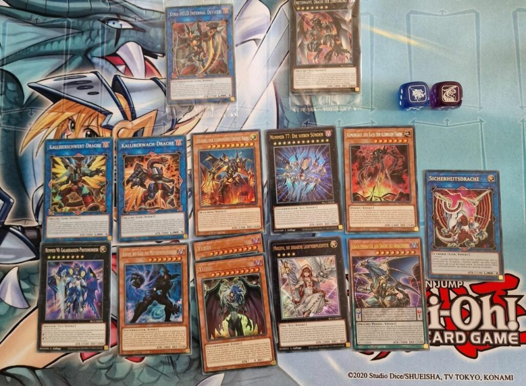 Wir durften 2 Boxen von „Battles of Legends“ und ein Display von „Phantom Nightmare“ öffnen, die uns Konami freundlicherweise zur Verfügung gestellt hat. Bei „Battles of Legends“ hatten wir pro Set eine extra verpackte Karte (Finsterdrache und Devicer, siehe Bild), sowie zwei Würfel, ein Würfel pro Box. Der schwarze Würfel ist vom Cyberdrachen, der blaue von Grosalamander. Ansonsten waren die Holos divers verteilt. Einige Kaijus waren drin, ein paar Linkmonster, ein Pendelmonster und drei XYZ-Monster. Sowie zweimal der zuvor erwähnte „Yubel“.