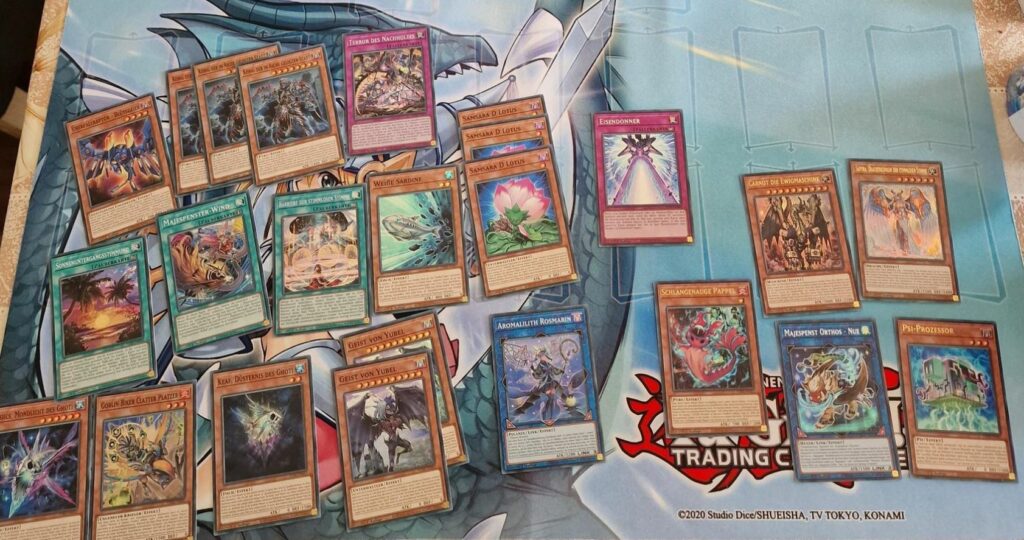 Beim Display „Phantom Nightmare“ hatten wir eine Fallenkarte (Eisendonner) als Secret Rare drin sowie ein Linkmonster (Majespenst Orthos-Nue) sowie 4 Ultra Rares, die ihr auf dem Bild weiter unten sehen könnt. Ansonsten hatten wir einige Super Rares drin, die Yubel oder die Aromamonster supporten, etwas Karten zum Ghoti-Thema und noch einige Monster und Zauberkarten, so wie eine Fallenkarte. Insgesamt ein guter Mix aus vielen Deckthemen zusammen. Eine Vierteljahrhundert Secret Rare hatten wir leider nicht gezogen.