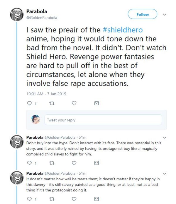 Selbstverständlich ließen die Reaktionen im Netz nicht lange auf sich warten. Während einige User einen Bogen um den Anime machen, kritisieren andere wiederum, dass vorgetäuschte Vergewaltigungen durchaus im realen Leben passieren können. Ein weiterer und zugleich sehr umstrittener Punkt, der ebenfalls im Anime thematisiert wird, ist das Halten einer minderjährigen Sklavin. Auch hier treffen die verschiedenen Seiten aufeinander.