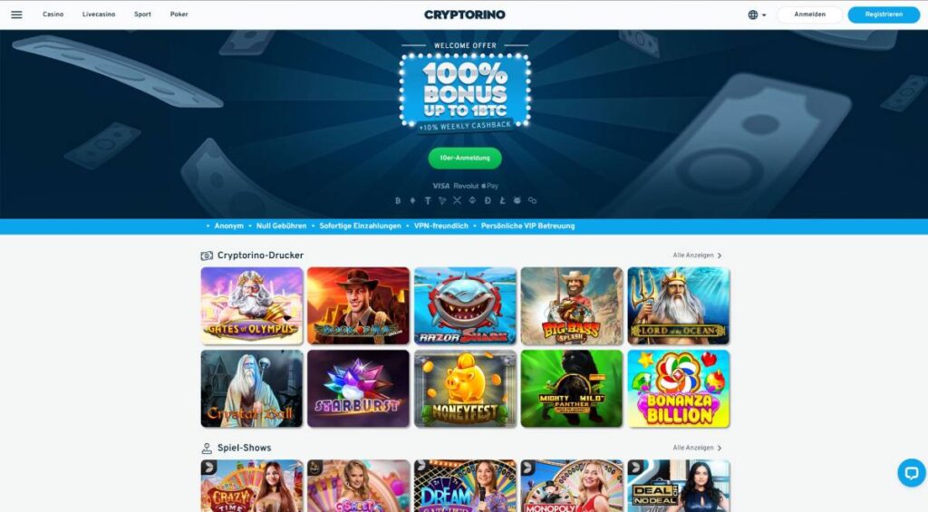 Cryptorino überzeugt als Casino ohne deutsche Lizenz mit den Vorteilen: anonymes Spiel, keine Gebühren, sofortige Einzahlungen und persönliche VIP Betreuung. Zudem ist dieses Crypto Casino VPN-freundlich. Als erster Bonus lockt die Chance auf 100 % bis zu 1 BTC, ein Cashback von 10 % ist zusätzlich vorhanden. Für High Roller ist dieses Casino ohne Limit somit gut geeignet.Zwar irritieren einige Begriffe auf der Webseite wie das Wort Drucker in Kombination mit dem Namen, aber das Programm der Spiele ist in diesem Online Casino Krypto-Angebot überzeugend.