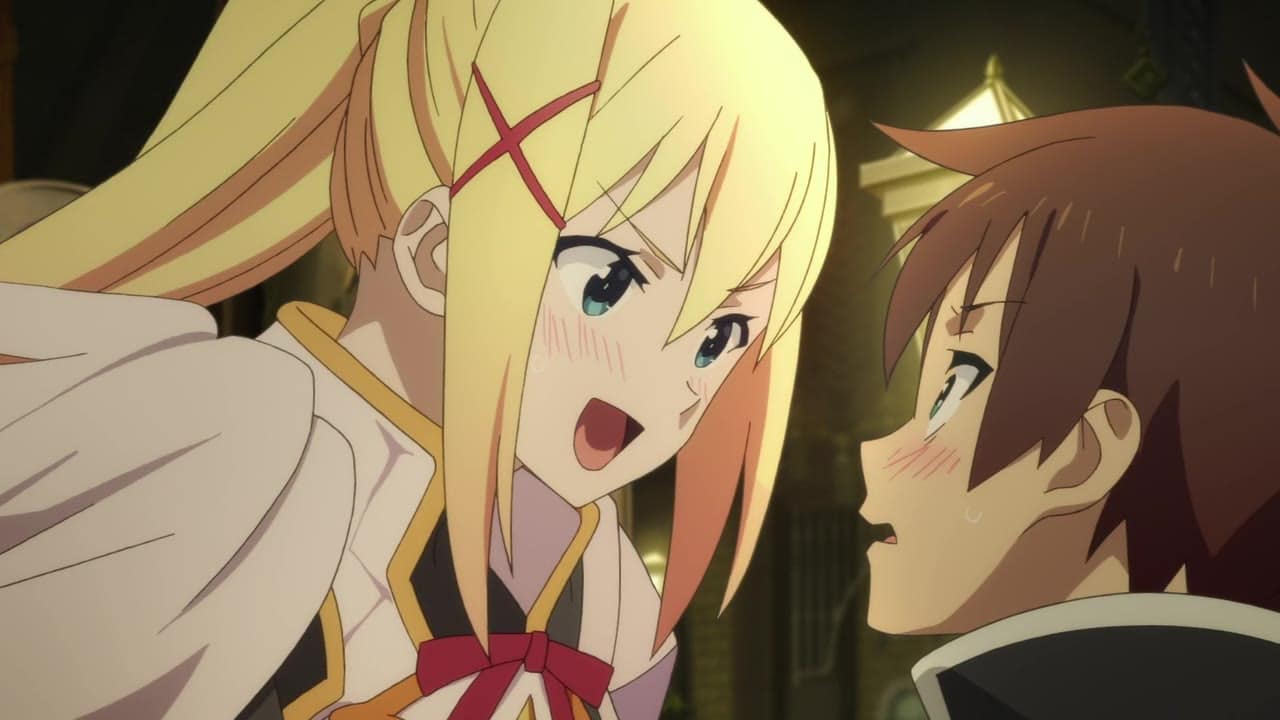 Dennoch gelingt es der Dreiergruppe insgesamt fünf riesige Frösche zu überwältigen. Als Kazuma noch am Überlegen ist, wie er Megumin am besten wieder loswird, erscheint plötzlich die Kreuzritterin Darkness auf der Bildfläche. Diese ist nicht nur wunderschön, sondern besitzt ebenfalls eine höhere Abenteurer-Klasse und möchte Kazumas Abenteurergruppe beitreten. Doch schon nach kurzer Zeit wird klar: Auch bei Darkness ist nicht unbedingt alles im Reinen. Nicht nur, dass das Mädchen eine astreine Masochistin zu sein scheint, hinzu kommt auch noch, dass fast keiner ihrer Schwerthiebe sein Ziel trifft. Eine Bekannte von Darkness scheint jedoch vernünftig zu sein und bringt Kazuma sogar einige nützliche Diebes-Skills bei. Als dieser mit dem Skill Steal, der normalerweise ein zufälliges Item des Gegners stiehlt, jedoch zweimal in Folge die Mädels ihrer Höschen beraubt, wird er schnell als Perversling abgestempelt. Da hilft es auch nicht, dass Aqua und Megumin nach der Jagd auf die Frösche völlig mit Froschsabber besudelt neben ihm in der Stadt ankamen.
