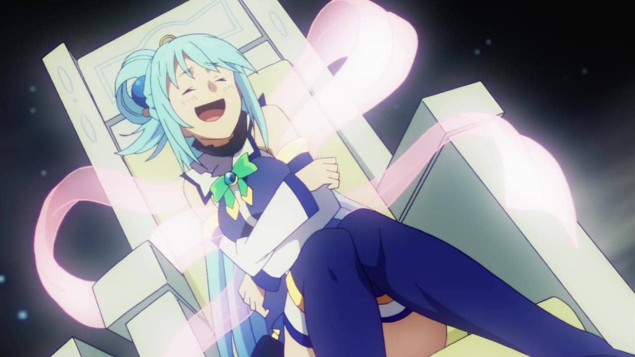 Kurz darauf findet sich unser Protagonist bereits im Angesicht der Göttin Aqua wieder, die für den Verbleib der Seelen von gestorbenen Japanern zuständig ist. Dabei stellt sich heraus, dass Kazuma völlig unnötig gestorben ist, denn bei dem herannahenden Fahrzeug handelte es sich nicht – wie er dachte – um einen LKW, sondern um einen langsamen Traktor, dem jeder spielend leicht hätte ausweichen können. Auch Kazuma selbst wurde nicht etwa von diesem Traktor überrollt. Stattdessen hat er aus Todesangst einen Herzstillstand erlitten und ist daraufhin gestorben.
