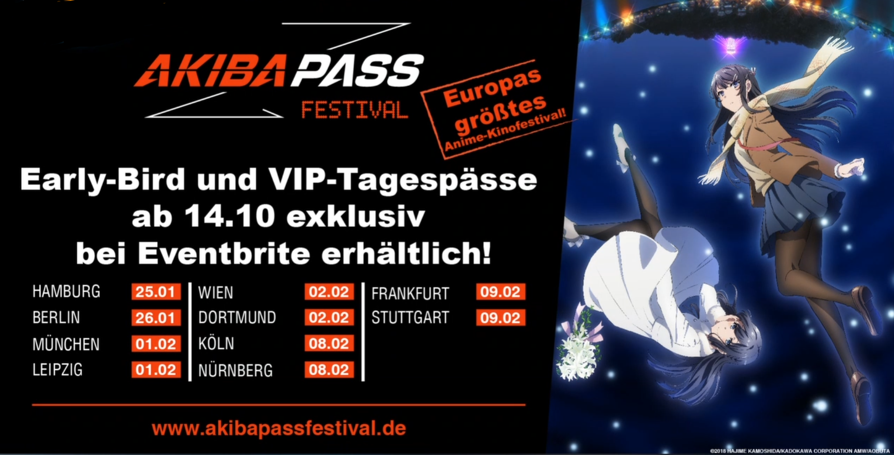 Das AKIBA PASS Festival 2020 findet Ende Januar und Anfang Februar 2020 in insgesamt zwölf deutschen und österreichischen Städten statt. Derzeit läuft bereits die zweite Phase des Ticket-Vorverkaufs. Die genauen Termine findet ihr hier: