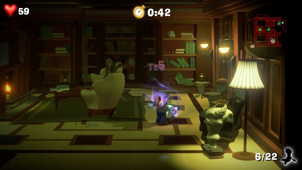 Das Kampfsystem und die Steuerung in Luigi’s Mansion 3 sind relativ komplex. Es gibt einen Sauger, mit dem ihr etwas ansaugen oder auch wegstoßen könnt. Des Weiteren gibt es den Stroboblitz, mit dem ihr Geister blenden könnt, damit ihr diese anschließend einsaugen könnt. Nachdem ihr diesen eingesaugt habt, müsst ihr diesen durch die Gegend schleudern, bis seine Lebensleiste auf 0 gesunken ist. Natürlich ist Fluigi auch wieder am Start und hilft euch, wenn mal spezielle Hindernisse überwunden werden müssen, oder ihr einfach die Power von 2 Personen benötigt.