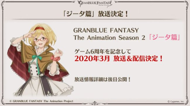 Wie nun im Rahmen des „Granblue Fantasy Fes 2019“- Events bekannt gegeben wurde, wird der „Granblue Fantasy“-Anime im März 2020 ein Special zur zweiten Staffel erhalten. Das Anime-Special trägt den Titel „Djeeta-hen“ (engl. „Djeeta Chapter“).