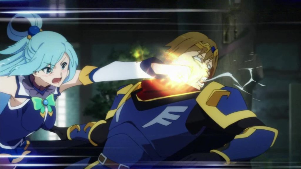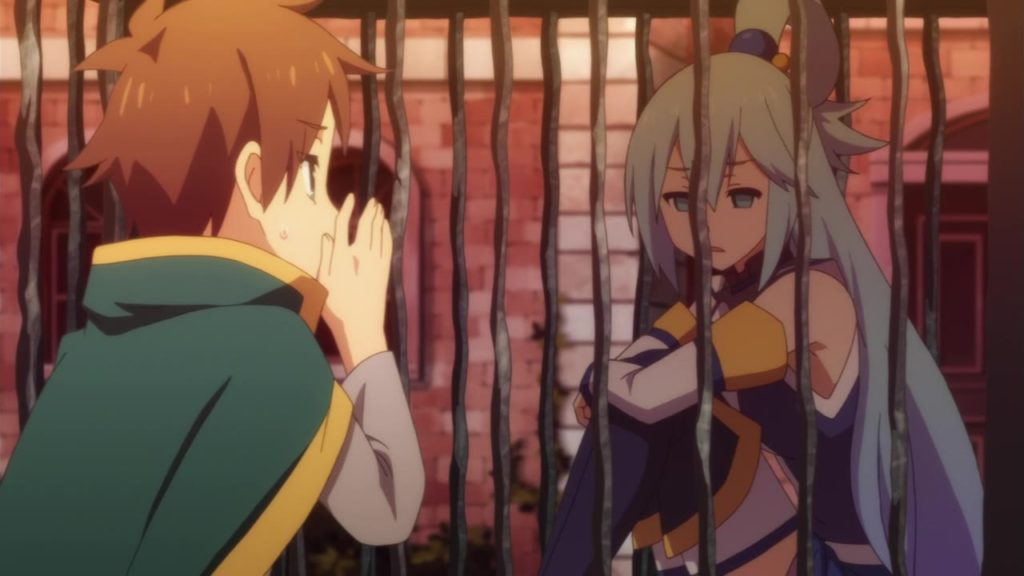 Auf dem Weg zurück in die Stadt möchte sie sich darum nicht aus ihrem Käfig herausbewegen, was bei dem Abenteurer Kyouya Mitsurugi zu einem Missverständnis führt. Bei ihm handelt es sich um einen ehemaligen Japaner, der von Aqua vor Kazuma in diese Welt entsandt wurde, um den Dämonenkönig zur Strecke zu bringen. Das Bild, das sich ihm nun bietet, lässt ihn vermuten, dass Aqua vom Rest der Gruppe gefangen gehalten und unterdrückt wird, weshalb er Kazuma zum Duell fordert, das die Göttin als Preis vorsieht.