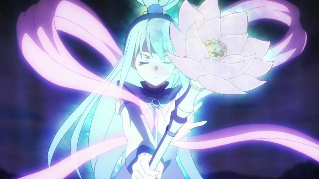 Es stellt sich allerdings heraus, dass Aqua zum Reinigen des Wassers am besten dauerhaften Kontakt mit dem See haben sollte. Auch in diesem Fall dauert das Reinigungsritual aber noch einen halben Tag – eigentlich kein Problem, wären da nur nicht die aggressiven Alligatoren, die sich im dreckigen See pudelwohl fühlen. Kazuma hat jedoch eine Idee und so kommt es, dass die Gruppe loszieht und Aqua in einem starken Metallkäfig im Flachwasser des Sees sitzen muss, als sei sie ein Teebeutel. So ist sie zwar vor den angreifenden Riesenechsen sicher, doch nach mehreren Stunden im Angesicht dieser Bestien trägt die nutzlose Göttin ein Trauma davon.