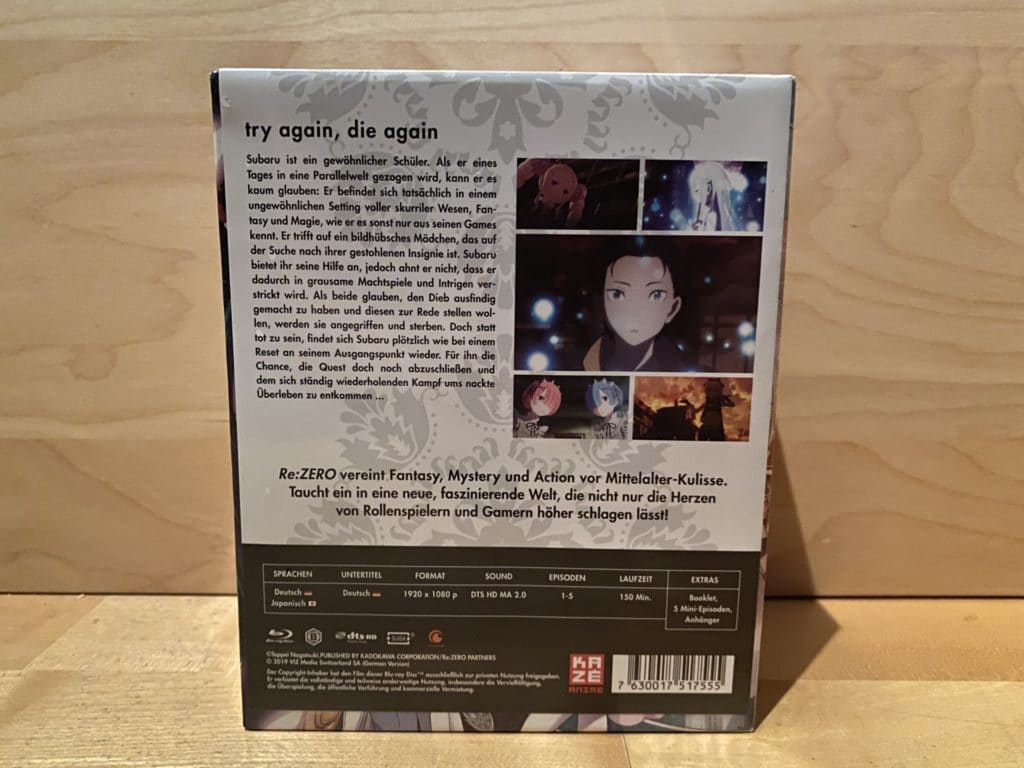 Ihr kennt es bereits von unseren weiteren Reviews: Die physische Umsetzung des Produkts hat keinen Einfluss auf die Gesamtwertung der Rezension. Dennoch geben wir euch einen kurzen Überblick, um euch die eventuelle Kaufentscheidung zu erleichtern. Dabei beziehen sich alle nachfolgenden Informationen auf die limitierte Blu-Ray-Fassung des ersten Volumes von „Re:ZERO“.