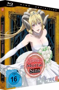 Das erste von zwei Volumes von „Seven Mortal Sins“ wird voraussichtlich am 20. April 2020 im Handel erscheinen. Darin enthalten sind die ersten sechs Episoden mit deutscher Synchronisation sowie mit japanischem Originalton und deutschen Untertiteln. Mit dabei sind umfangreiche Extras. Im Einzelnen handelt es sich dabei um ein 32-seitiges Booklet, ein Wendeposter, Clear Opening und Ending, Astaroths Musikvideo sowie 10 Mini-Episoden.