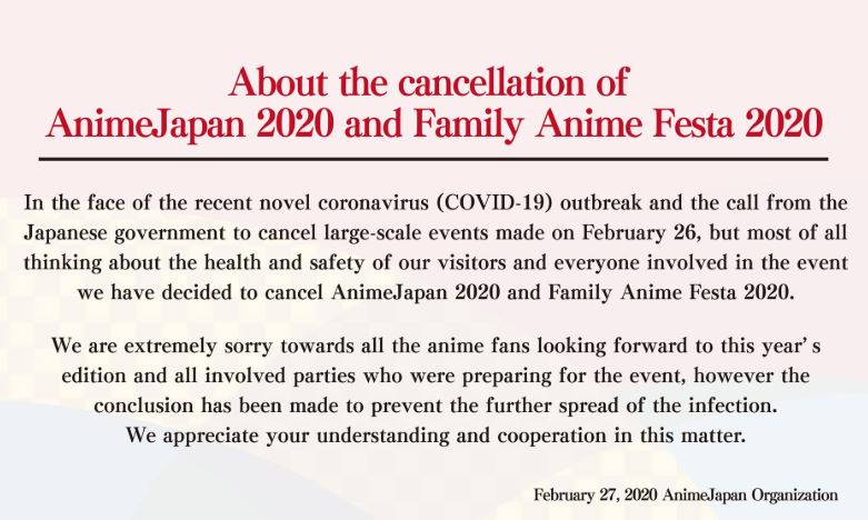 In einer Stellungnahme auf der offiziellen Webseite des Events teilte man diesen Entschluss mit und bezog sich dabei auch auf einen Aufruf der japanischen Regierung vom 26. Februar 2020, in dem darum gebeten wird, Massenveranstaltungen aufgrund der aktuellen Gesundheitslage abzusagen. Gleichzeitig wies man aber auch darauf hin, dass die Gesundheit der Besucher an oberster Stelle stehe und man sich somit zu diesem Schritt entschlossen habe.