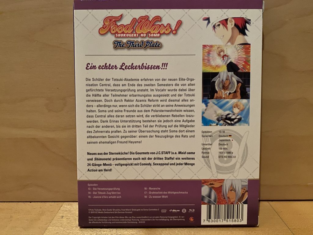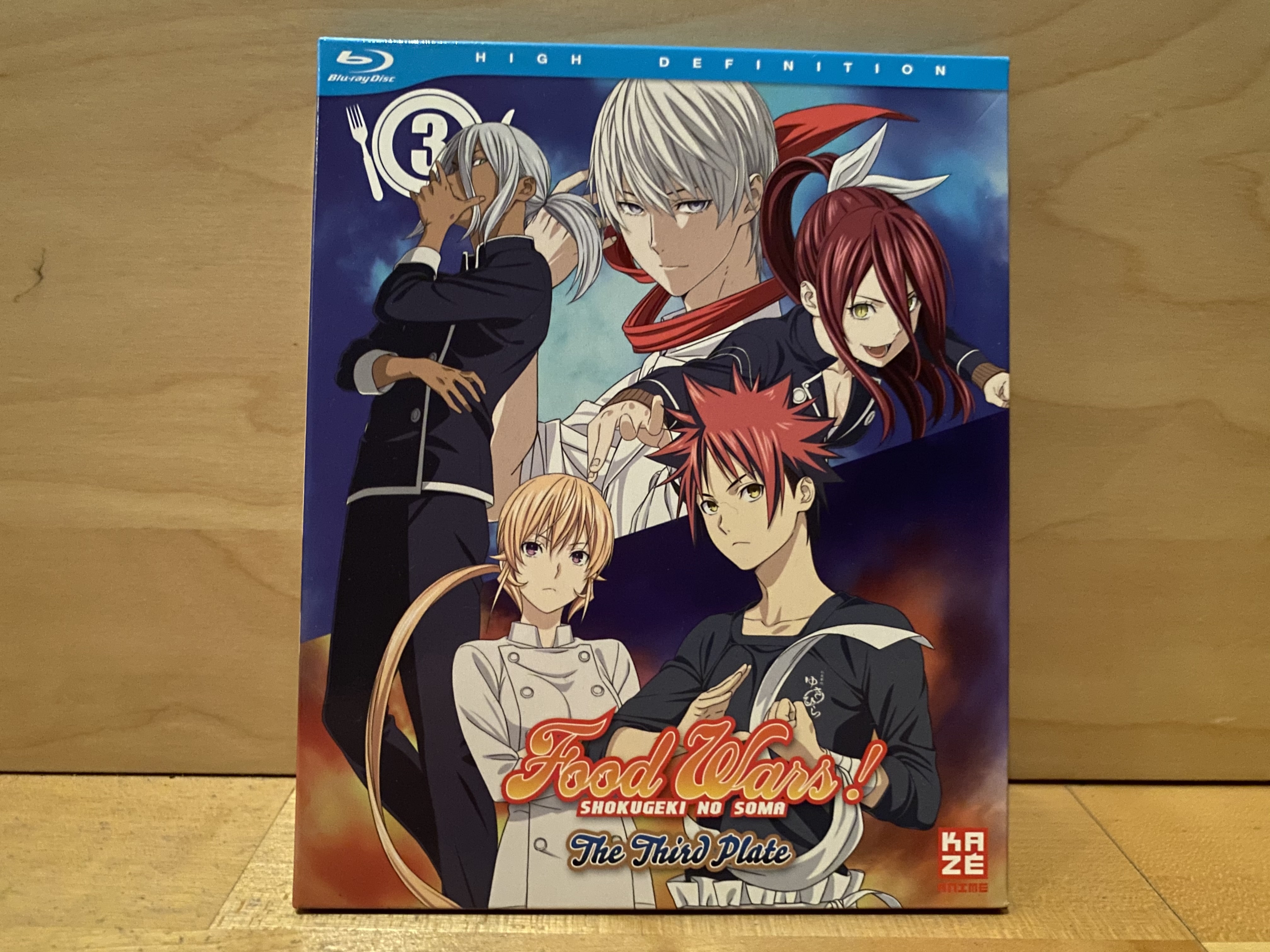 Ihr kennt es aus unseren weiteren Reviews: Die physische Aufmachung des Produkts spielt für die Gesamtwertung der Rezension keine Rolle. Dennoch geben wir euch einen kurzen Überblick, über das, was euch im Falle eines Kaufs erwartet. Die nachfolgenden Bilder und Informationen beziehen sich dabei auf die Blu-Ray-Variante des dritten Volumes von „Food Wars! The Third Plate“.