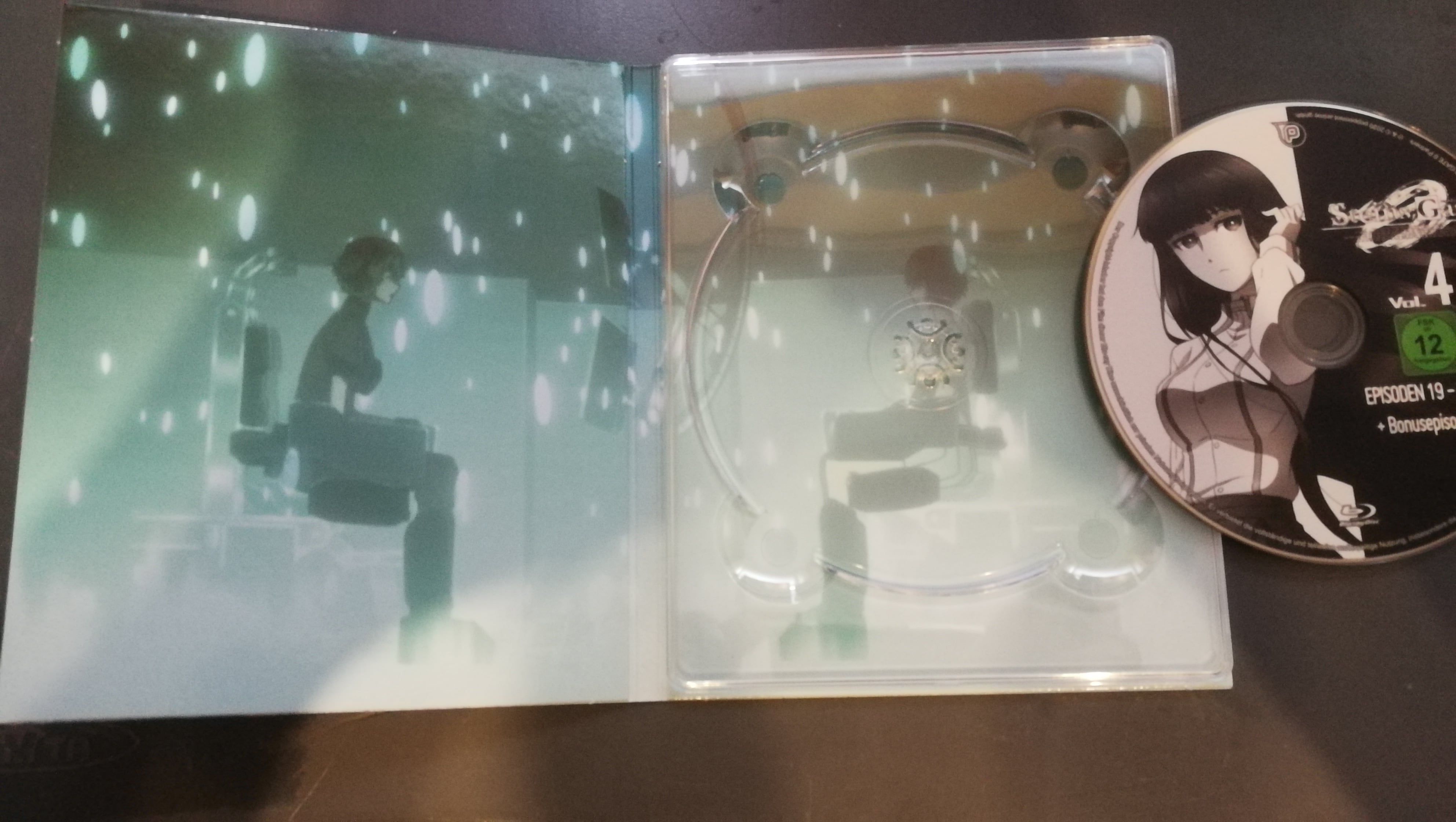 Das Volume kommt wie gewohnt in einem Digipack mit eigenem Pappschuber daher. Das FSK-Logo auf dem einigermaßen stabil wirkenden Schuber ist glücklicherweise nur aufgeklebt und lässt sich rückstandslos entfernen. Als Motiv für dieses Volume wurde Kagari gewählt, welche auf der Rückseite von einer grimmig dreinblickenden Suzuha ergänzt wird. Auf der Innenseite des Digipacks sieht man Suzuha und Mayuri in der Zeitmaschine sitzen. Leider ist das FSK-Logo auf das Digipack selbst aufgedruckt.