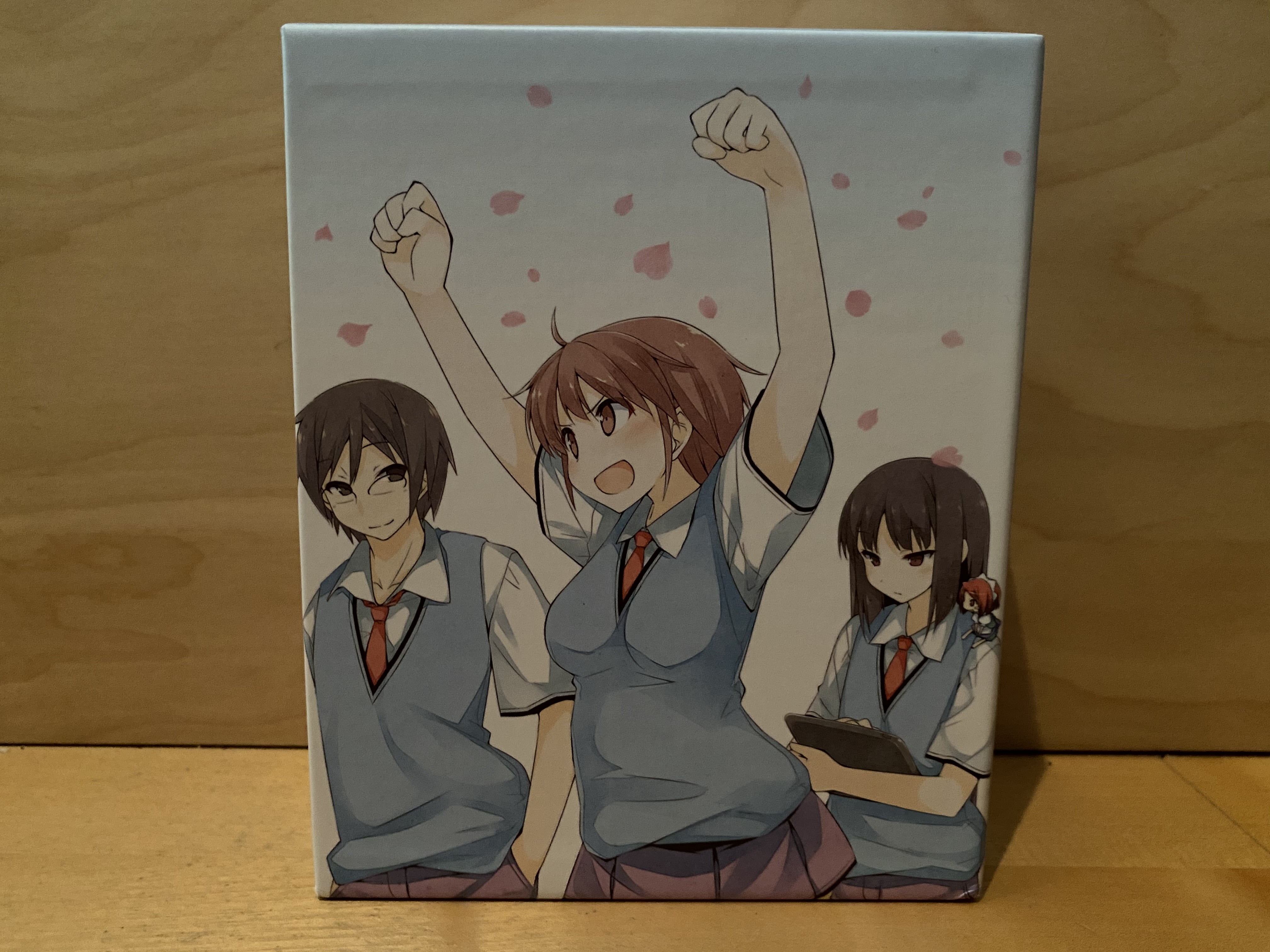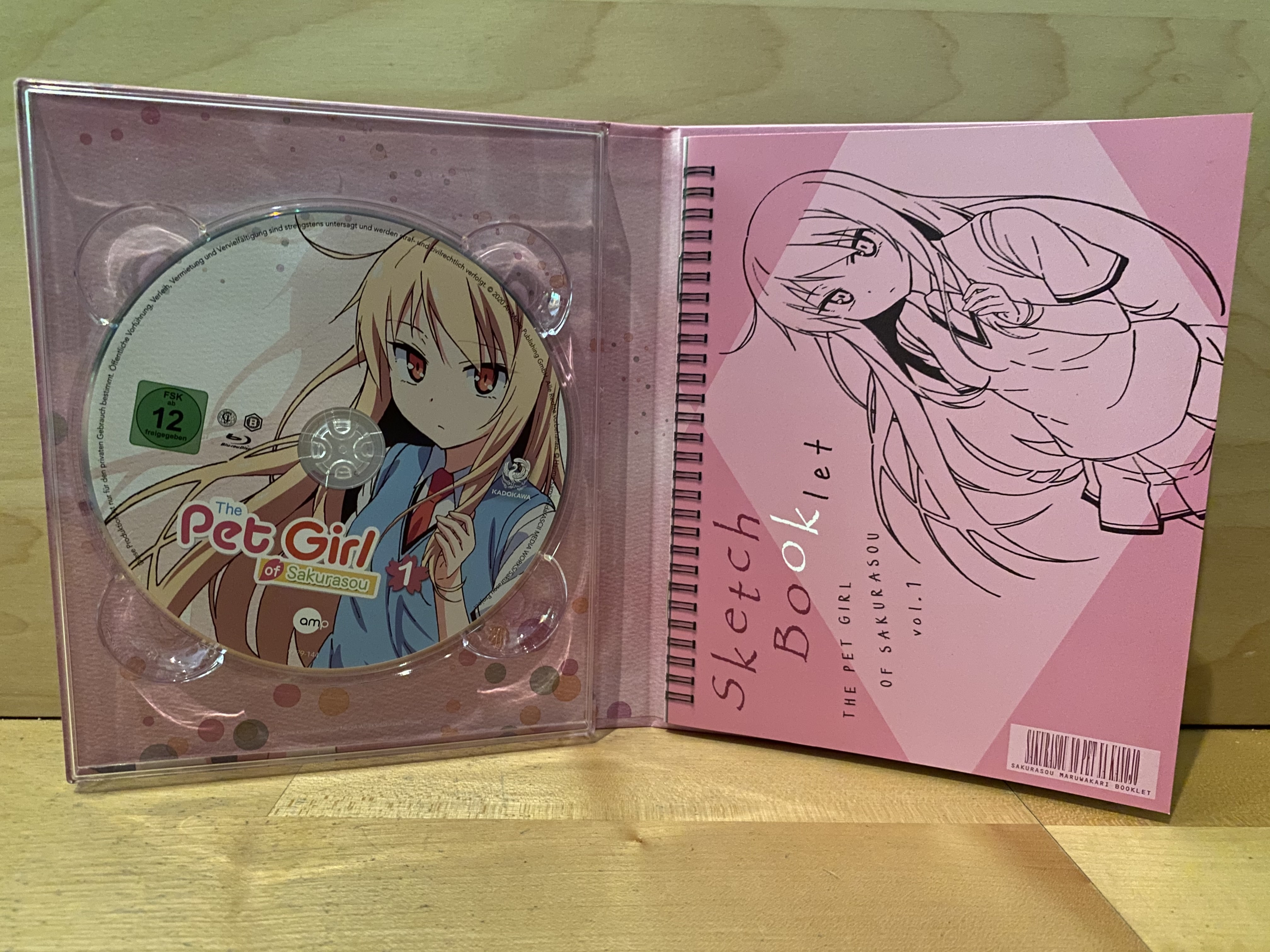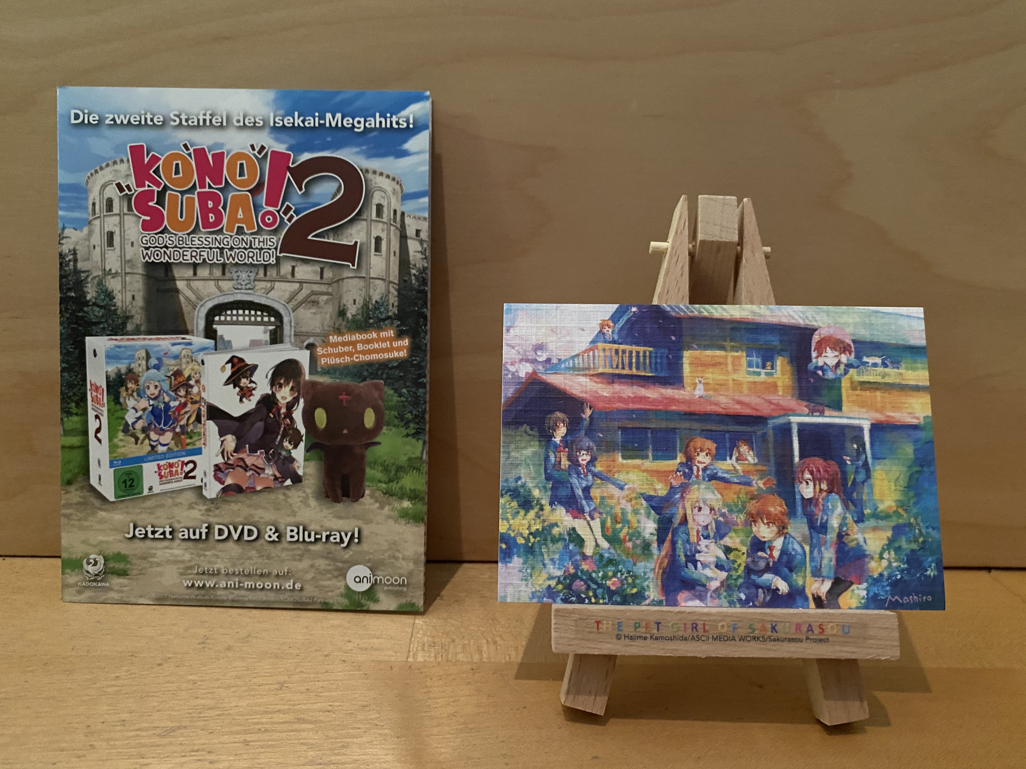 Wie bereits erwähnt hat man sich bei der Veröffentlichung von „The Pet Girl of Sakurasou“ für ein Mediabook entschieden. Dieses hat die von weiteren AniMoon-Releases gewohnt gute Qualität und kommt mit einem Sammelschuber daher, der Platz für alle vier Volumes der Serie bietet. An dessen Stabilität gibt es nichts auszusetzen und auf der Front sind Sorata, Mashiro und Nanami zu sehen. Auf der Rückseite ist indes eine Illustration von Jin, Misaki, Ryunosuke und Maid zu sehen. Auf ein aufgedrucktes FSK-Logo konnte sowohl auf dem Schuber als auch auf dem Mediabook verzichtet werden. Dieses befindet sich stattdessen auf dem Backflyer, der ansonsten alle wichtigen Informationen zum Anime und dem Inhalt des Volumes enthält. Als physisches Extra ist neben dem integrierten Booklet diesmal zudem eine schicke Mini-Staffelei mit an Bord.