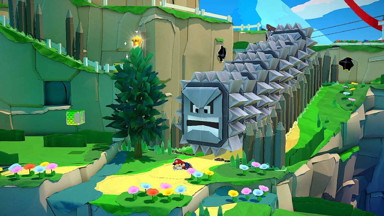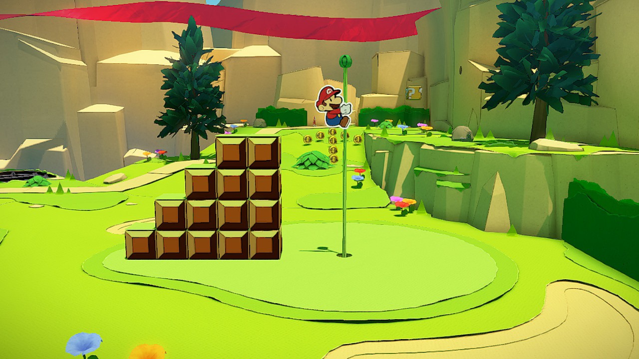Zusätzlich sind die „?-Blöcke“ nun relativ selten, was einen Überraschungsmoment auslöst und diese tragen auch zu der Sammelstatistik bei. Dazu gibt es sogenannte Mini-Trophäen, die man in Schatzkisten findet. Später kann man diese im Museum besichtigen. Überall auf der Spielwelt lässt sich erkennen, was die bösen Origami-Schergen anrichten. Diese falten alles zusammen und damit auch die Toads. Diese gilt es zu retten. Es lohnt sich die Spielwelt detailliert zu untersuchen, um die Toads zu finden. Das macht Spaß, da diese immer etwas erzählen und sie nicht alle nach dem gleichen Schema versteckt sind.