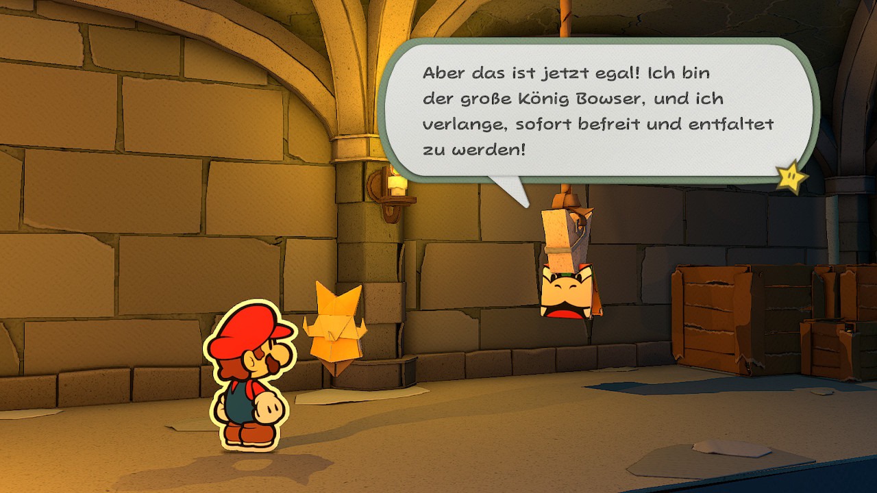 Während Bowser uns hinterher läuft, gibt dieser immer wieder lustige Kommentare ab uns es wirkt erfrischend, sich mal mit dem Erzfeind gegen Prinzessin Peach zu verbünden. Doch wir merken, dass Prinzessin Peach von dem bösen Origami König Olly kontrolliert wird, welcher jeden wortwörtlich zusammenfalten und zu einem Origami-Schergen machen möchte. Nachdem Mario sich aus dem Kerker befreien konnte, wird König Olly sauer, hüllt den Palast in Papierschleifen ein und verfrachtet ihn auf einen Berg. Letztendlich ist es unsere Aufgabe, jede Welt zu bereisen, um die Papierschleifen zu lösen.