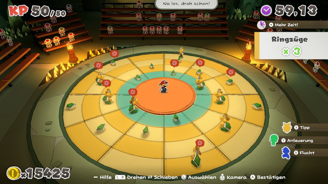 Dieses ganze Kampfsystem mit dem Puzzlespiel und mit dem perfekten Schlag ist letztendlich etwas glücksbasiert. Es funktioniert bei Pokémon auch nicht immer einen Gegner mit einer Attacke zu erledigen. Manchmal schlägt diese auch fehl und so ist es auch in „Paper Mario: The Origami King“. Manchmal nimmt man sich vor, ohne Leben zu verlieren durch die Welt zu streifen. Eine Male klappt das perfekt, doch ein kleiner Fehler beim Puzzle und ihr bekommt eine gegnerische Attacke ab. Deswegen ist beim Spielen stets Konzentration erforderlich, um am Anfang das Puzzle zu lösen. Auch eine gute Möglichkeit, um euch mitdenken zu lassen.
