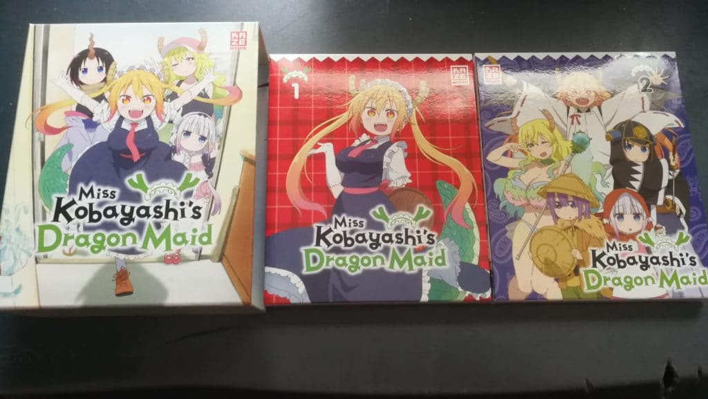 Wie ihr es von uns schon kennt, hat die physische Umsetzung des Produkts keinen Einfluss auf die Gesamtwertung des Reviews. Dieser Abschnitt dient mehr dazu, euch ein Bild von dem zu vermitteln, was euch als Käufer erwartet. Dabei beziehen sich alle Beschreibungen auf die Blu-Ray-Fassung der Volumes 1 und 2 von „Miss Kobayashi’s Dragon Maid“.