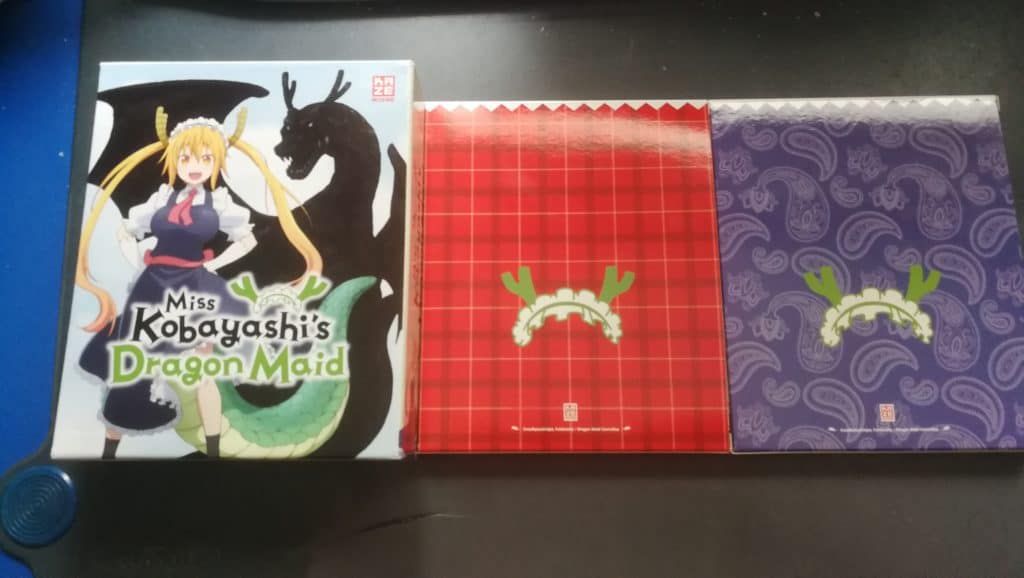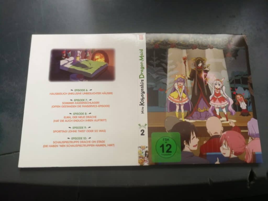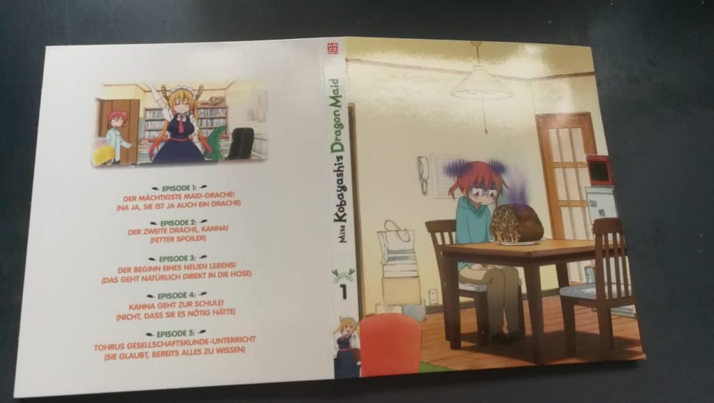Die beiden Volumes kommen jeweils in einem Digipack mit eigenen Pappschubern daher. Die FSK-Logos auf den Schubern sind nur auf der Plastikfolie aufgeklebt. Jedoch sind sie leider auf den Digipacks selbst aufgedruckt. Der beiliegende Sammelschuber zeigt auf einer Seite Tohru, Lucoa, Kanna und Elma, auf dem Rücken Tohru und hinten Tohru mit ihrer Drachenform im Hintergrund. Volume 1 hat Tohru als Motiv, während Volume 2 Kanna, Elma, Tohru, Lucoa und Shouta in Kostümen, welche sie in einer Folge tragen, zeigt. Die Rückseite beider Volumes zeigt Tohrus Hörner und ihre Maid-Haube. Was wir noch positiv anmerken wollten ist, dass KAZÉ offenbar aus dem Fehler mit dem Kleber auf dem Schuber bei „The Ancient Magus Bride“ gelernt hat, da das Inlay nicht angeklebt war und somit das Risiko, den Schuber zu beschädigen, nicht bestand.