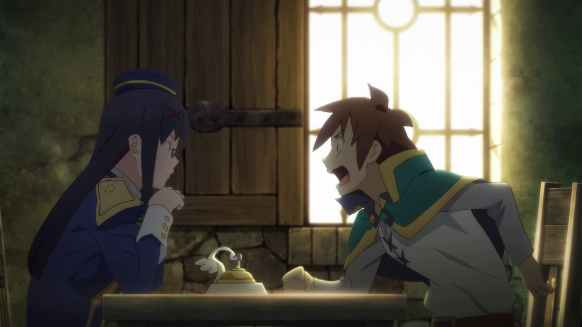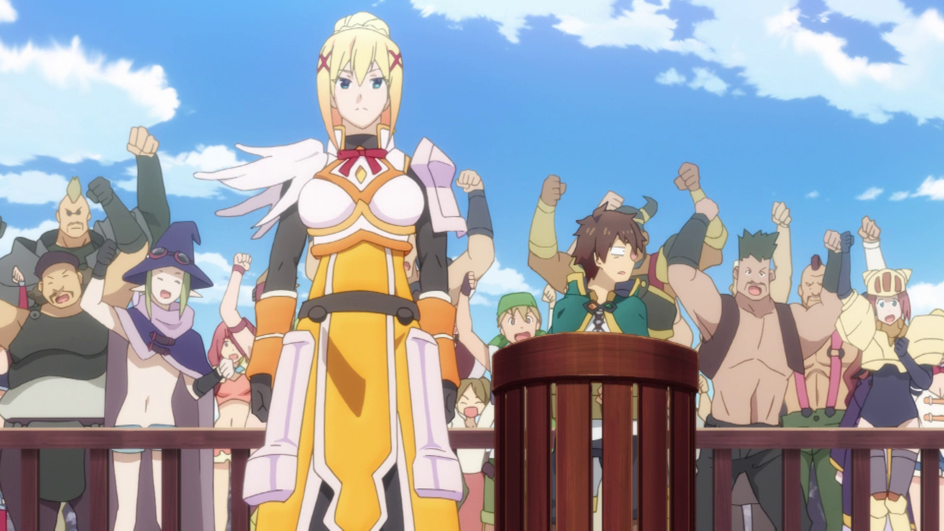 Auch die Zeugenbefragungen vor Ort laufen alles andere als positiv. Obwohl die Befragten Kazuma eigentlich in Schutz nehmen möchten, wird er als Unterhosen- und Schwertdieb gebrandmarkt. Zunächst sieht es also wirklich schlecht für ihn aus, doch durch einige gezielte Aussagen vor dem Lügendetektor scheint sich Kazuma aus der Affäre ziehen zu können. Der Feudallord kann das aber nicht auf sich sitzen lassen und übt Druck auf den Richter aus, bis sich Darkness einmischt, die sich als Tochter der mächtigen Dustiness Familie zu erkennen gibt, um Kazuma vor dem Todesurteil zu retten.