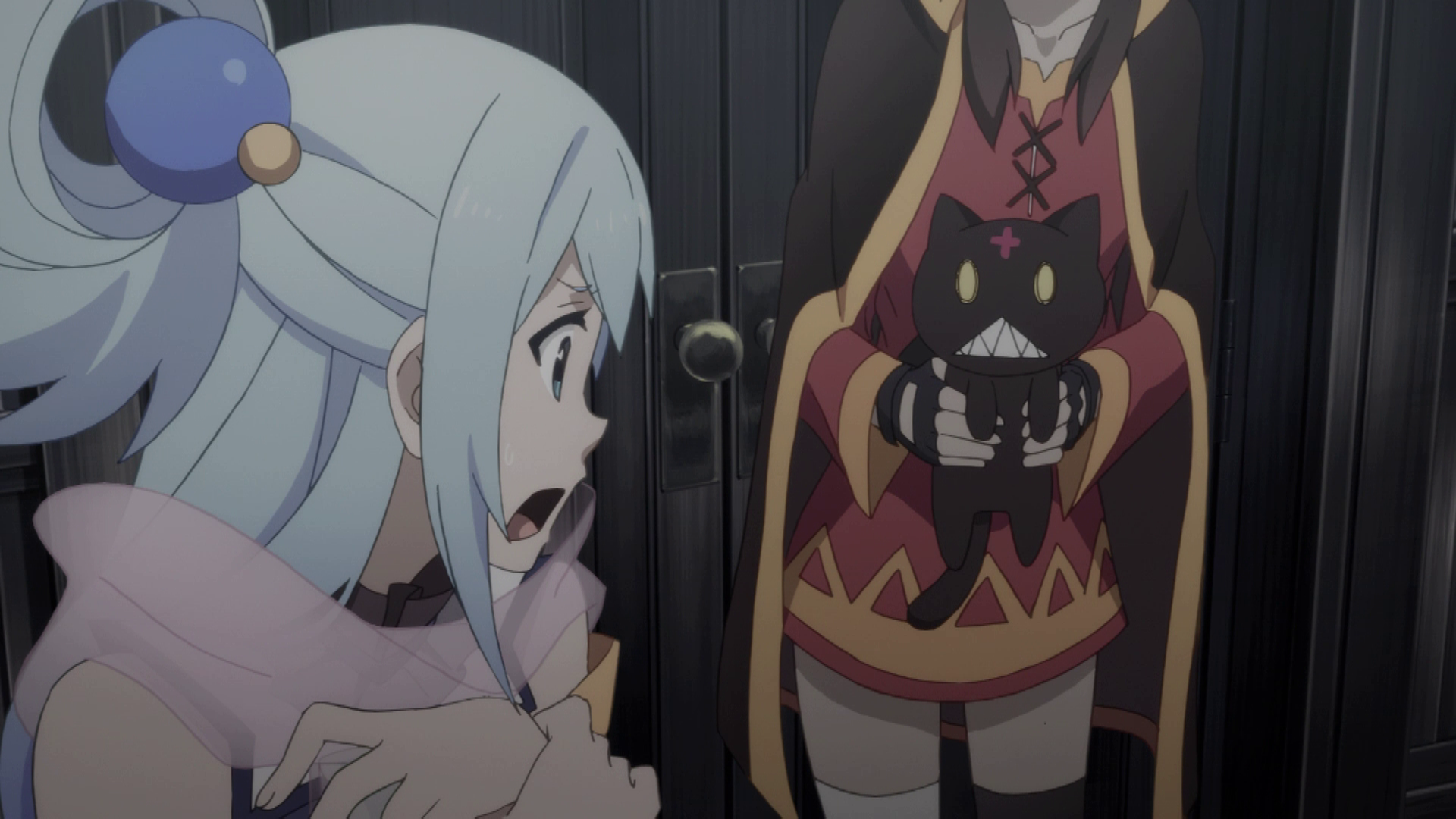 Kurz darauf schleppt Megumin eine Katze an, die sie behalten möchte und Chomosuke tauft. Plötzlich taucht die Staatsanwältin bei der Gruppe auf, die nach Kazuma sucht. So soll sich unsere Abenteurergruppe um die Monster vor der Stadt Axel kümmern. Dabei handelt es sich allerdings wieder einmal um die bereits aus der ersten Staffel bekannten Riesenkröten und der Kampf gegen diese läuft kein bisschen besser als zuvor.
