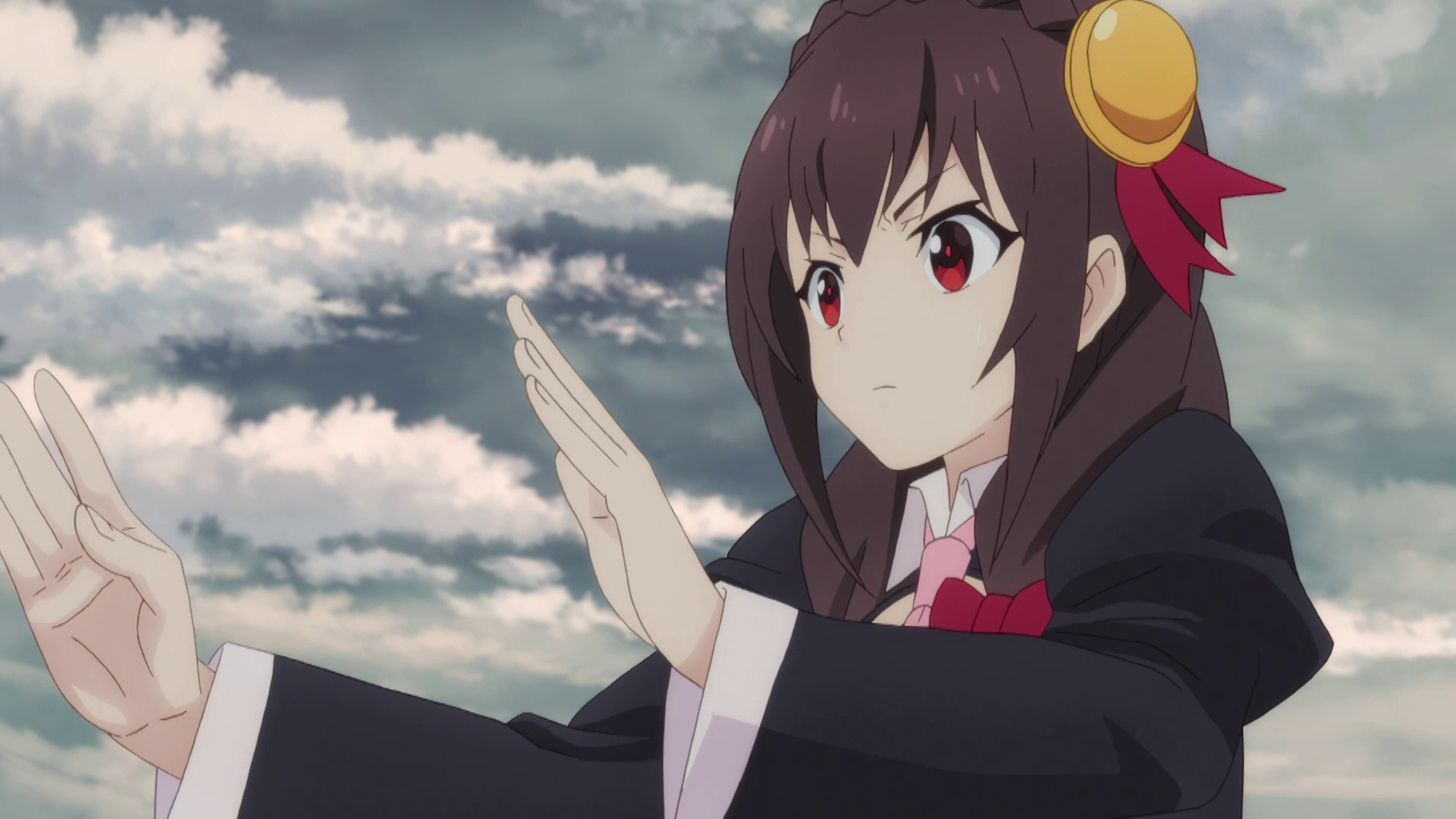 Als es sogar richtig schlecht aussieht taucht plötzlich ein Mädchen auf, das die Gruppe mit ihren Zaubern rettet und sich als Yunyun vorstellt. Sie scheint sich zudem selbst zu Megumins Erzrivalin erklärt zu haben und stammt ebenfalls aus dem Dorf der Crimson Dämonen. Megumin lehnt ihre darauf folgende Herausforderung zunächst ab, da sie an diesem Tag keine Magie mehr nutzen kann. Sie lässt sich dann jedoch auf einen Kampfsportwettkampf ein, bei dem sie die eigentlich überlegene Yunyun durch den Krötenschleim zur Aufgabe bringt, der ihren Körper noch immer bedeckt.