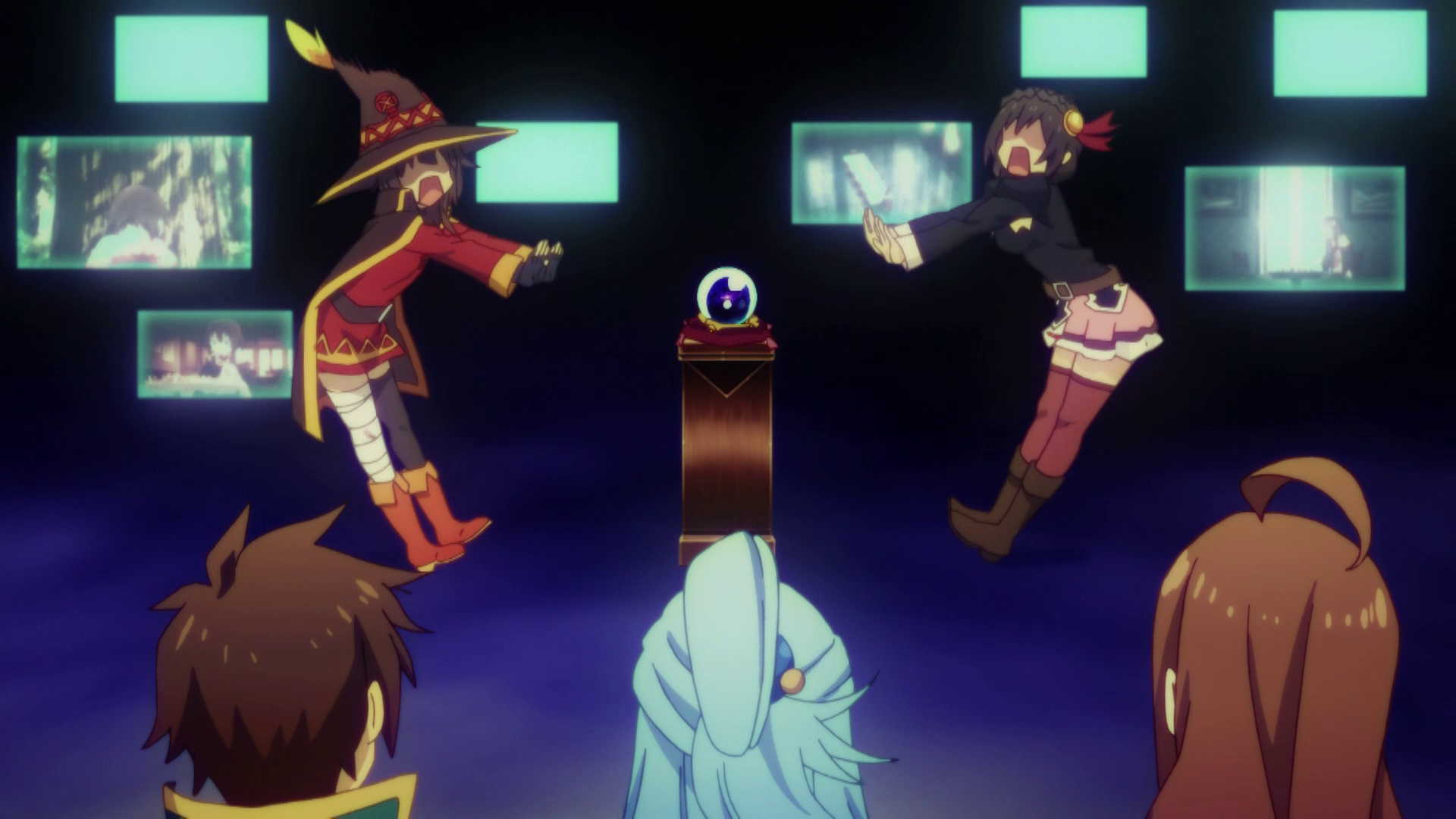 Nachdem sie anschließend auch Kazuma vollgeschleimt hat, streiten sich die beiden darum, wer zuerst baden darf, während Aqua in der Gilde die Belohnung für die Frösche kassiert. Im Endeffekt läuft es darauf hinaus, dass Megumin und Kazuma gemeinsam baden und Kazuma mit letzter Magiekraft die offene Badezimmertür einfrieren muss, damit Aqua davon nichts mitbekommt und ihn als Loli-Lover brandmarkt, was aber im Endeffekt doch nichts bringt. Im Laden von Wiz treffen sie anschließend erneut auf Yunyun und als sich Megumin und sie mit Hilfe des Items Freundschaftskristall erneut messen, werden allen Anwesenden lauter peinliche Szenen aus der Vergangenheit der beiden vorgeführt, bevor Megumin den Kristall aus Wut zerstört.