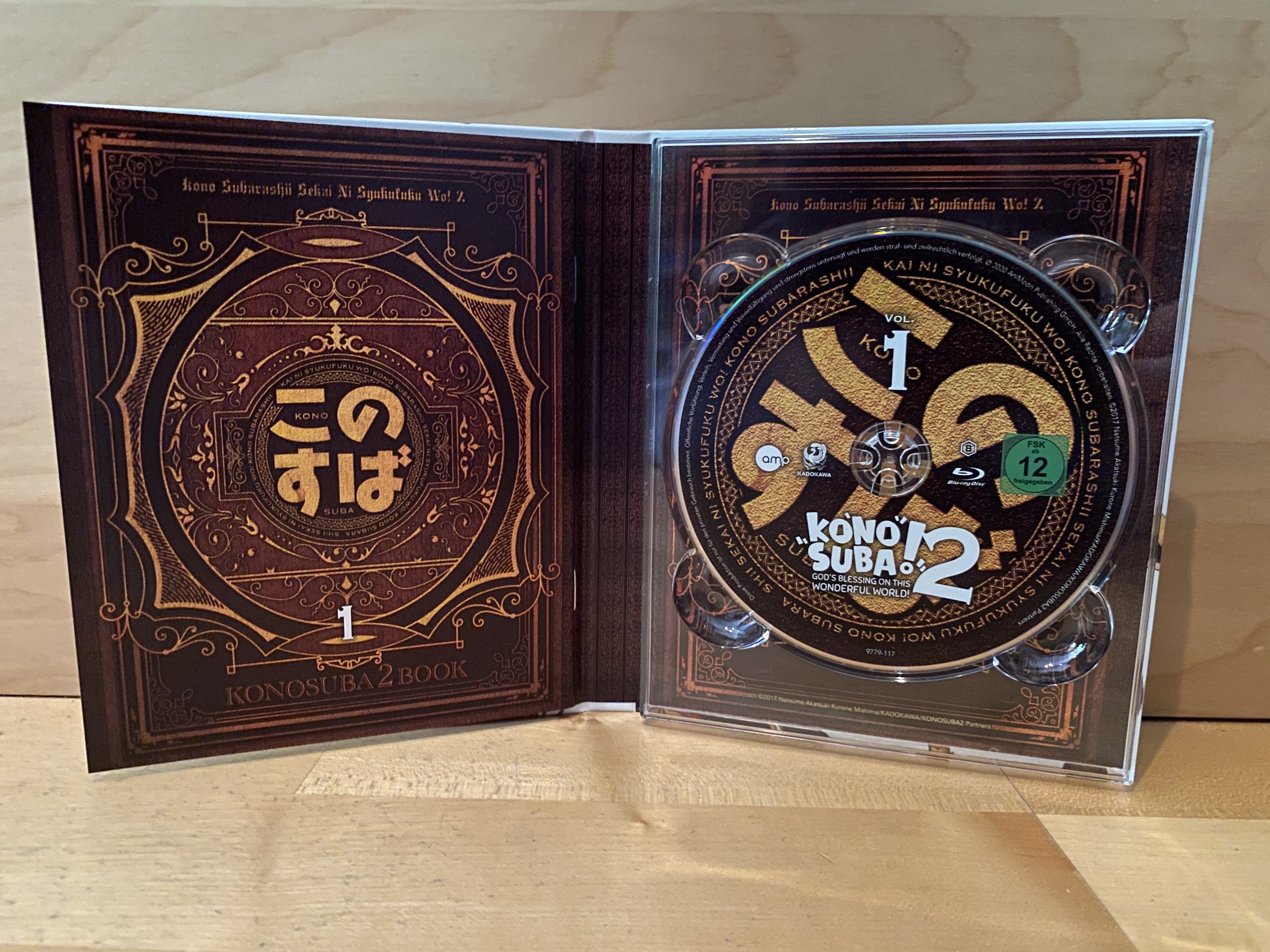 Auf dem neuen Sammelschuber, der Platz für alle drei Volumes der zweiten Serienstaffel sowie für den Film „Legend of Crimson“ bietet, sind wieder Kazuma, Aqua, Megumin und Darkness abgebildet. Auf dem Mediabook des ersten Volumes ist hingegen Yunyun zu sehen. Zudem sind Megumin und Kazuma in ihren Chibi-Varianten mit von der Partie. Auf der Rückseite Sind Kazuma und Megumin mit einer Chibi-Darkness abgebildet. Auf aufgedruckte FSK-Logos wurde löblicherweise wieder verzichtet.