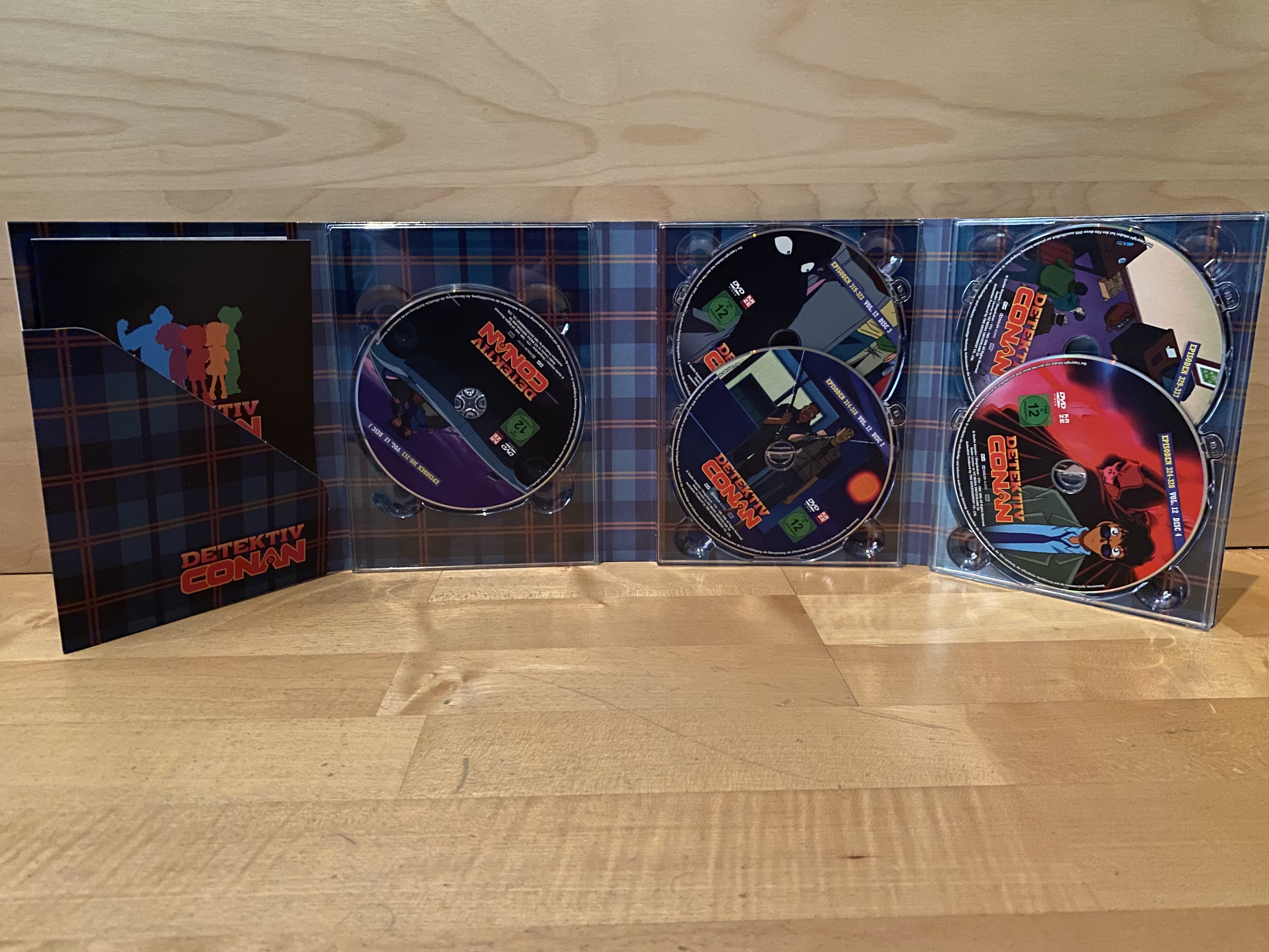 Natürlich bleibt auch Box 12 dem bekannten Design der vorherigen Boxen treu und kommt als mehrfach aufklappbares Digipack im eigenen Schuber daher. Letzterer erscheint von seiner Stabilität her ausreichend und auf ein aufgedrucktes FSK-Logo wurde löblicherweise verzichtet. Ein solches befindet sich dafür auf dem Digipack selbst. Sowohl der Schuber als auch das Digipack werden übrigens von einer Cover-Illustration geziert, die neben Conan die weiteren Detective Boys und einen Serienkiller zeigt.