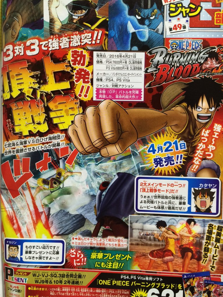 Am 3. Juni 2016 erscheint One Piece Burning Blood für die PS4, PS Vita und Xbox One, eien Version für Steam soll im selben Monat folgen. Wie jetzt bekannt wurde, werden auch vier Charaktere aus der Marineford Arc mit dabei sein. Bei diesen vier handelt es sich um: Jinbei, Edward Newgate, Marco der Phönix und Der Marine Admial Roter Hund (Akainu).