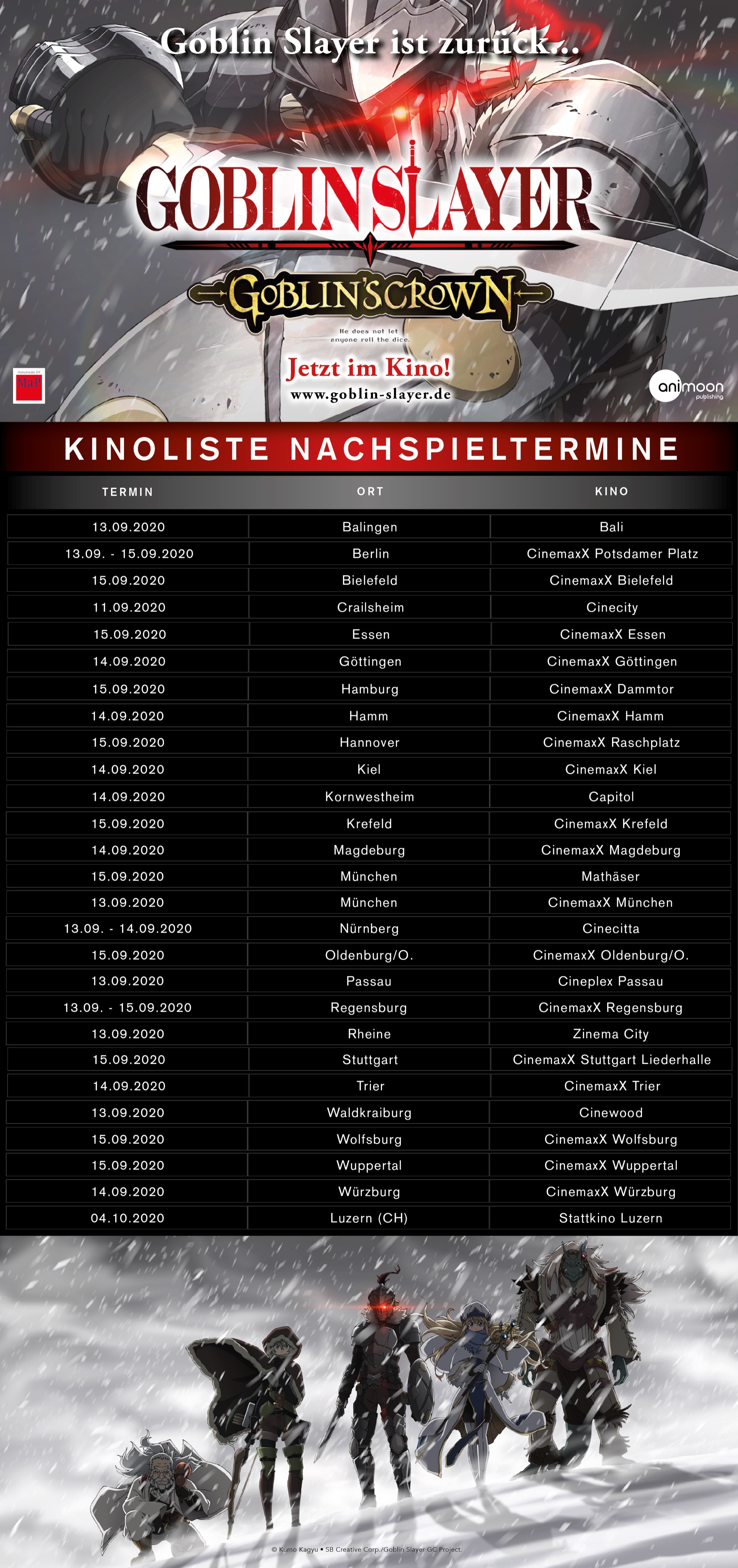 Wie Publisher AniMoon nun bekannt gab, wird es in einigen Städten noch einmal zusätzliche Kinotermine zum Film „Goblin Slayer: Goblin’s Crown“ geben.