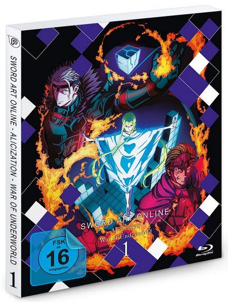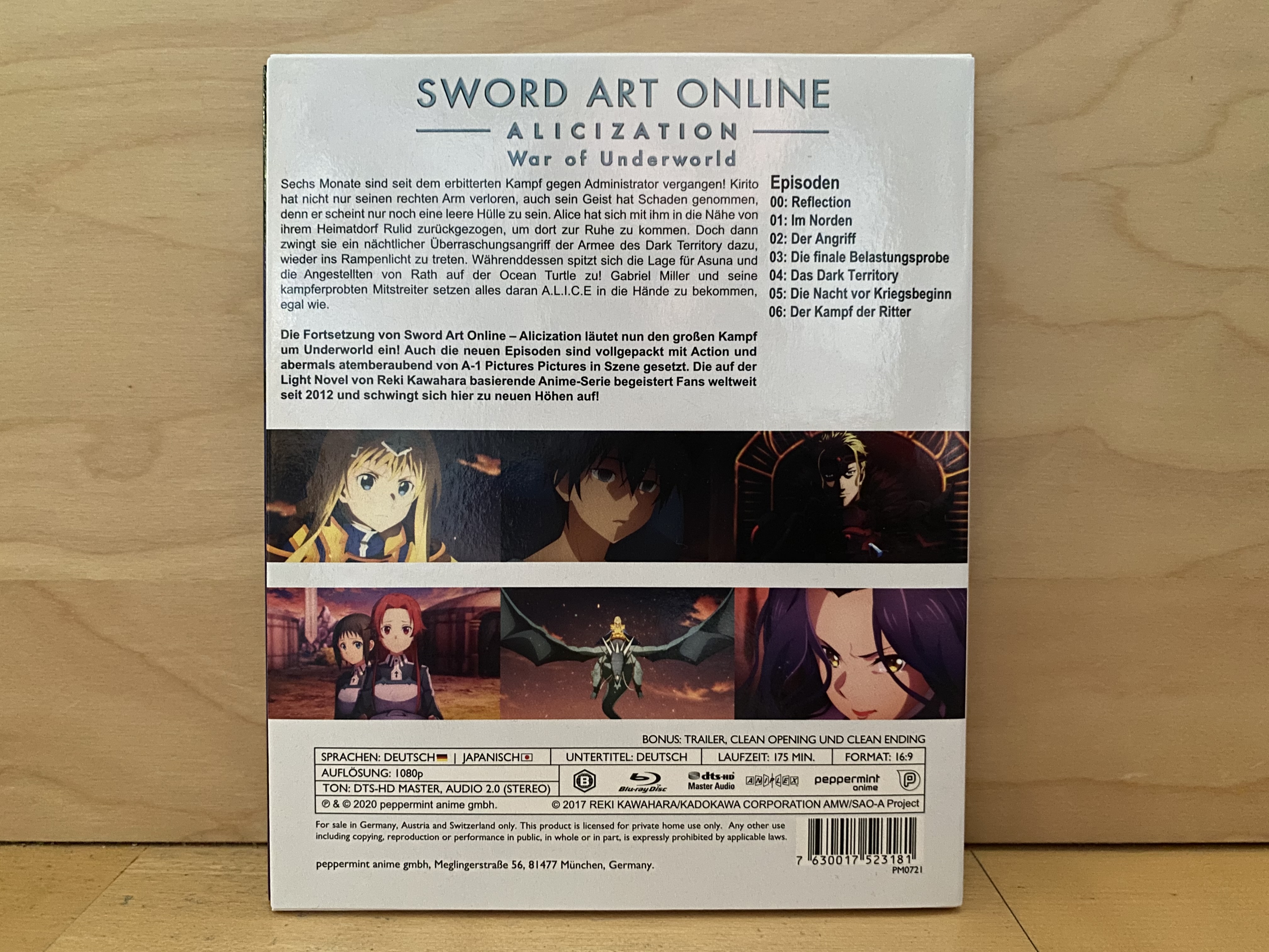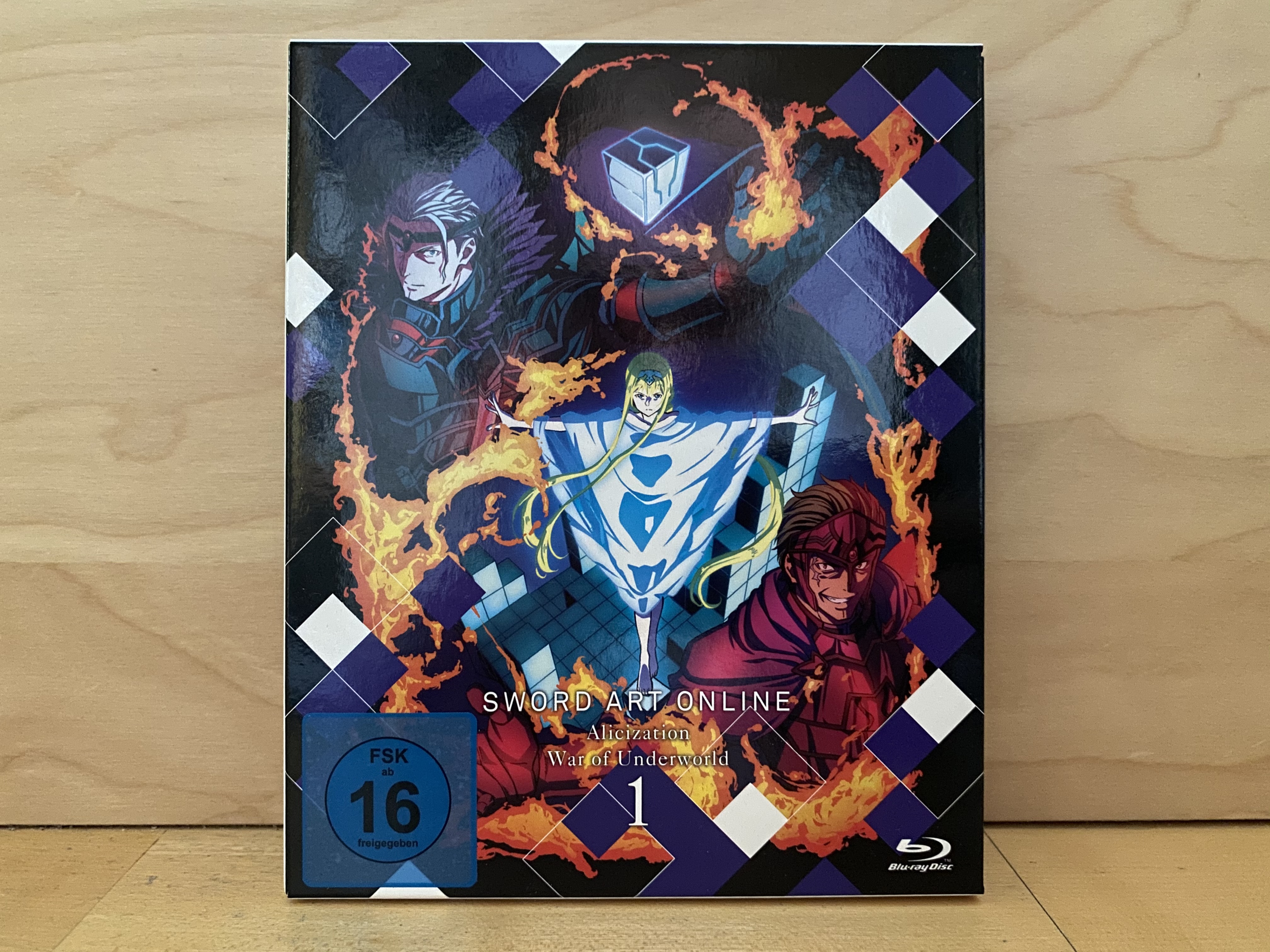 Bei der Veröffentlichung hat man sich an den weiteren Releases von SAO und natürlich besonders an der Disc-Veröffentlichung von „Sword Art Online Alicization“ orientiert, so dass auch das erste Volume von „War of Underworld“ wieder als schmales Digipack im eigenen Pappschuber daherkommt. Letzterer wirkt ausreichend stabil, sollte aber unbedingt trotzdem mit Vorsicht behandelt werden. Auf ein aufgedrucktes FSK-Logo konnte beim Schuber wieder verzichtet werden. Stattdessen ist dieses nur aufgeklebt und lässt sich mit ein wenig Vorsicht rückstandslos und ohne Probleme ablösen. Aufgedruckt ist hingegen das FSK-Logo auf dem Digipack selbst, das vom Design her wieder sehr schlicht gehalten wurde, während der Schuber auf seiner Front Alice und die beiden Antagonisten des Arcs zeigt.