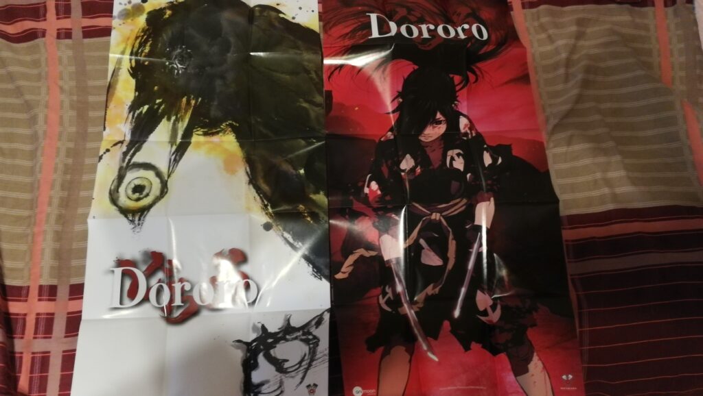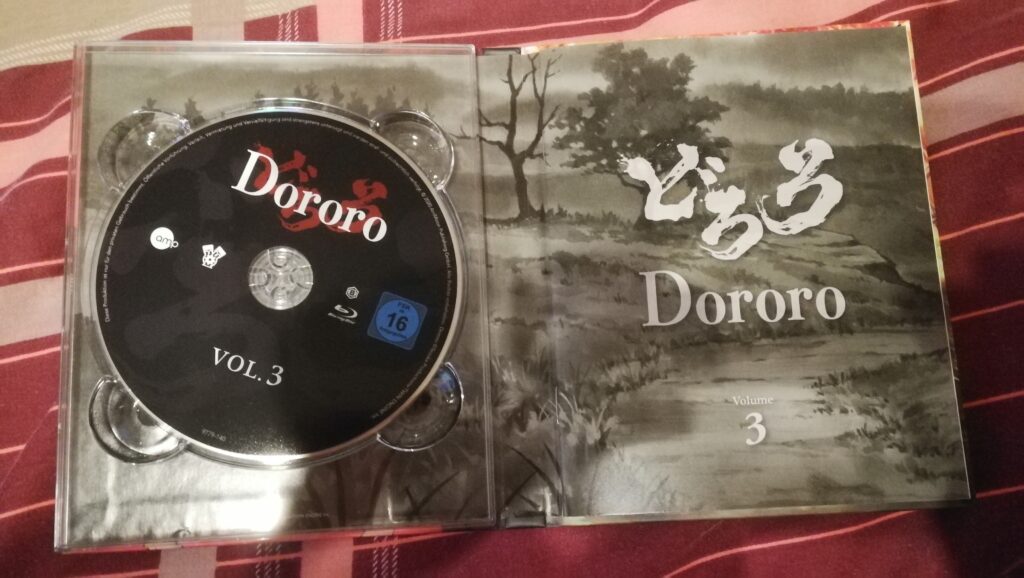 „Dororo“ kommt in der Mediabook-Version namensgebend in einem schicken Mediabook daher. Dieses zeigt auf einer Seite einen blutverschmierten und womöglich wütenden Hyakkimaru. Dieser hat seine Schwerter enthüllt. Auf der anderen Seite ist ein herbstlicher Wald zu sehen. Auf der Kante sieht man den Titel „Dororo“ in Hiragana wie auch romanischen Buchstaben ausgeschrieben. Das Mediabook ist sehr stabil und von hoher Qualität. Sehr erfreulich ist auch, dass auf selbigem kein FSK-Logo aufgedruckt ist. Als Extra zu Volume 3 gibt es zwei Maxi-Poster, eines mit dem Coverbild des Volumes und das andere mit einer Malerei einer Krähe, die einen Augapfel im Schnabel hält.