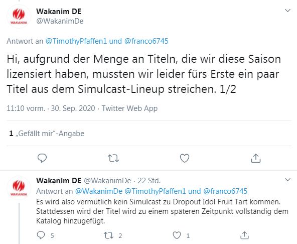 Wie Streaming-Anbieter WAKANIM gestern via Twitter bekannt gab, wird man den Simulcast des bereits vor einiger Zeit angekündigten Titels „Dropout Idol Fruit Tart“ streichen.