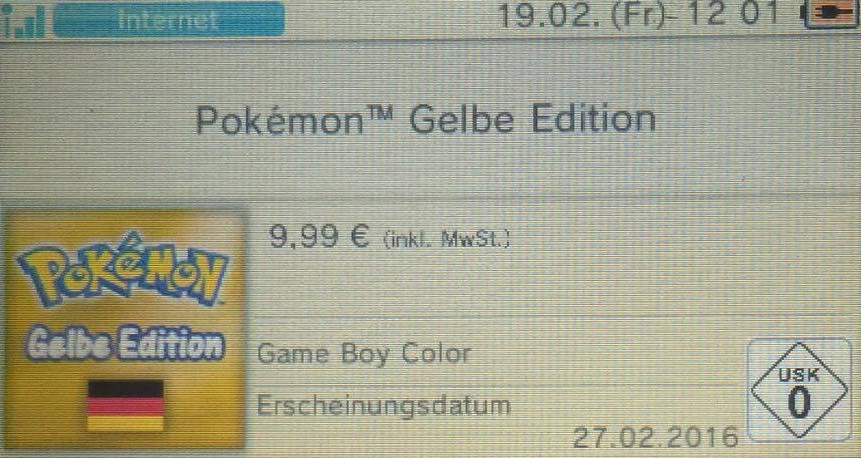 Am 27. Februar 2016 feiert Pokémon seinen 20. Geburtstag und an diesem Tag erscheint deswegen Pokémon Rote Edition, Pokémon Blaue Edition und Pokémon Gelbe Edition als Download für die Virtual Console des 3DS. Unssere Kollegen von Streetpass Germany haben nun heraus gefunden was die Spiele kosten, so muss man pro Spiel 9,99€ bezahlen.