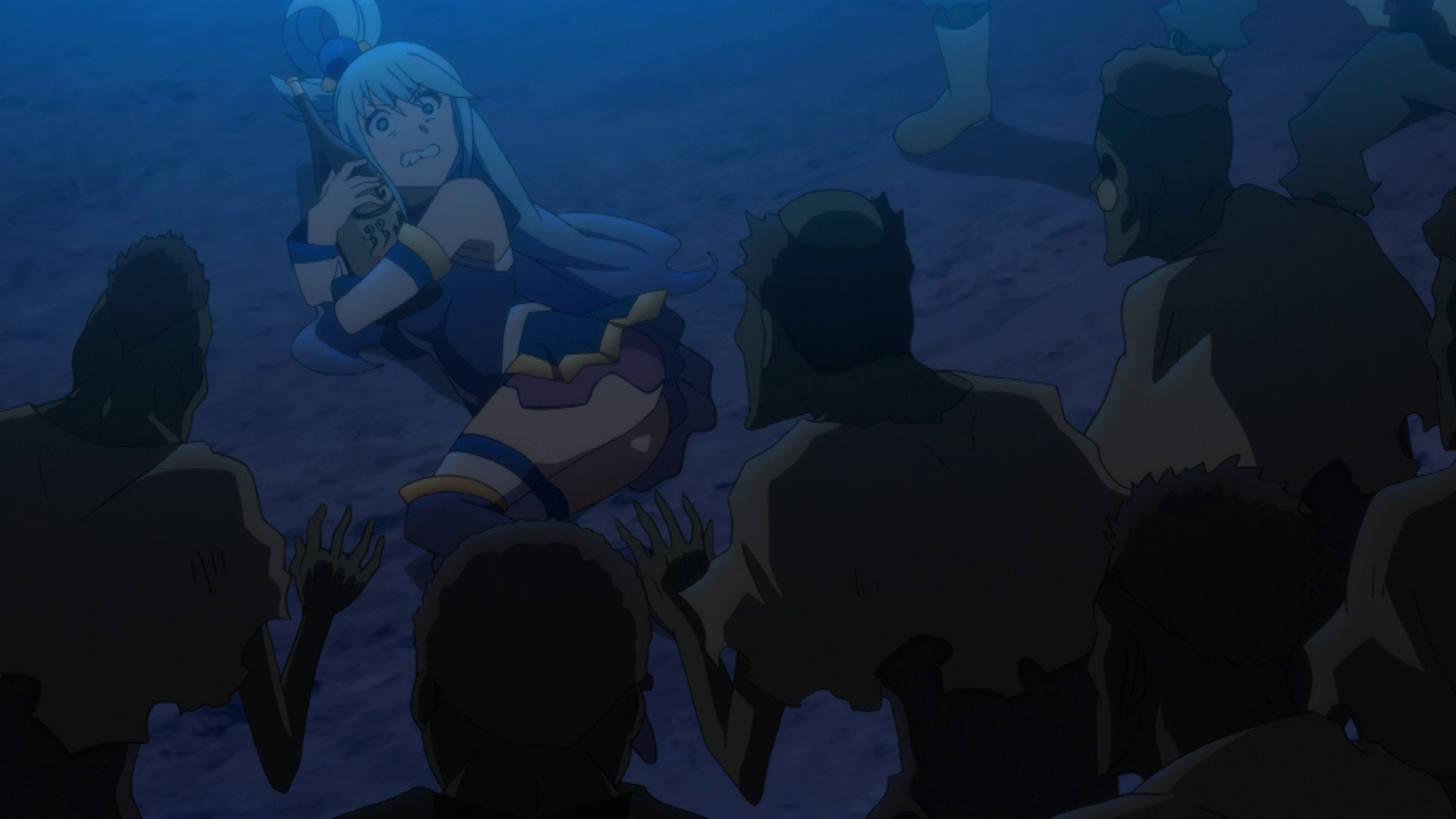 Als es zunächst wieder ruhig erscheint und sich alle zum Schlafen zusammenfinden, folgt plötzlich die nächste Gefahr: Eine ungewöhnlich große Horde Untoter bewegt sich zielstrebig auf die Kolonne zu. Als diese in der Nähe angekommen sind, wird Kazuma klar, dass sie von Aquas göttlicher Macht angezogen wurden, so dass er und seine Gruppe erneut für den Zwischenfall verantwortlich sind. Als Aqua die Untoten mit ihrer Hohepriesterinnenmagie ins Jenseits schickt, sind die restlichen Kolonnenmitglieder erneut so begeistert und dankbar, dass sie unseren Freunden gar eine monetäre Belohnung anbieten. Kazuma kann nur beschämt ablehnen…