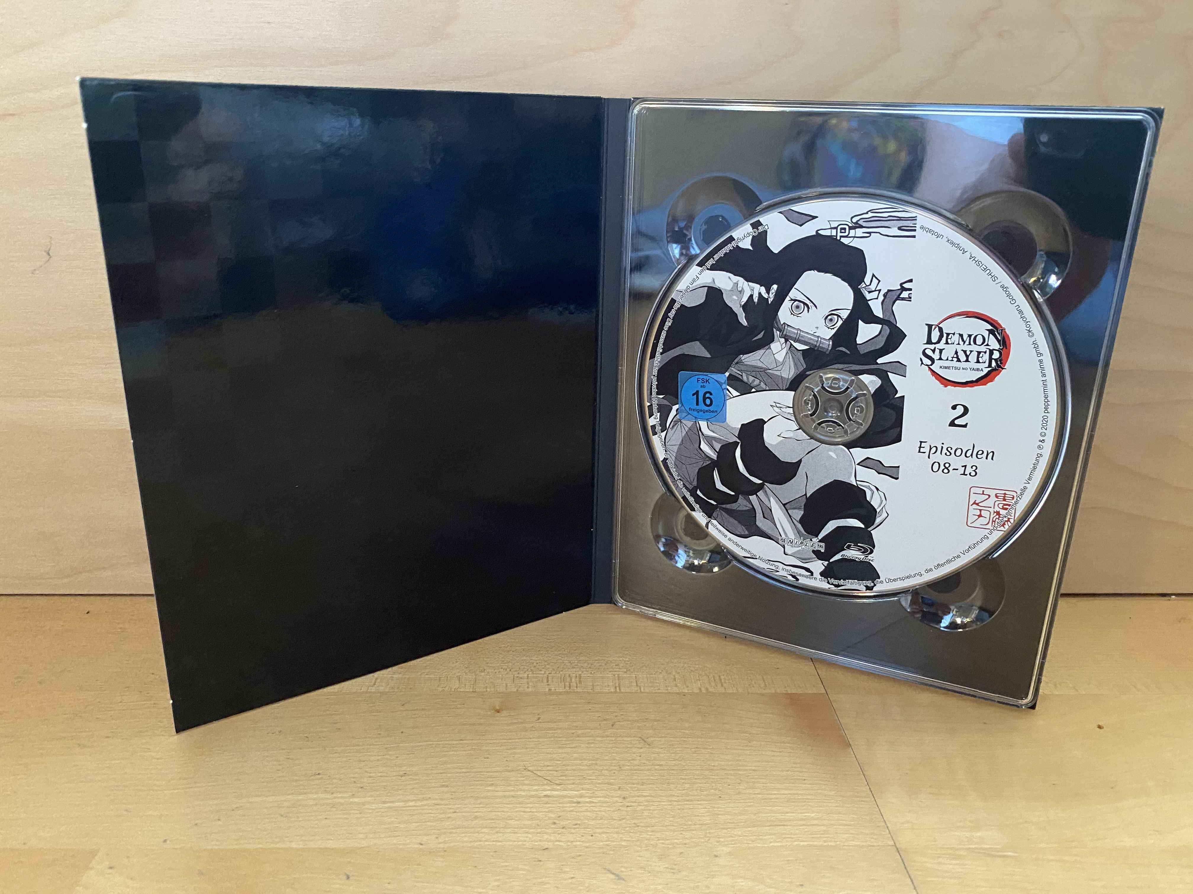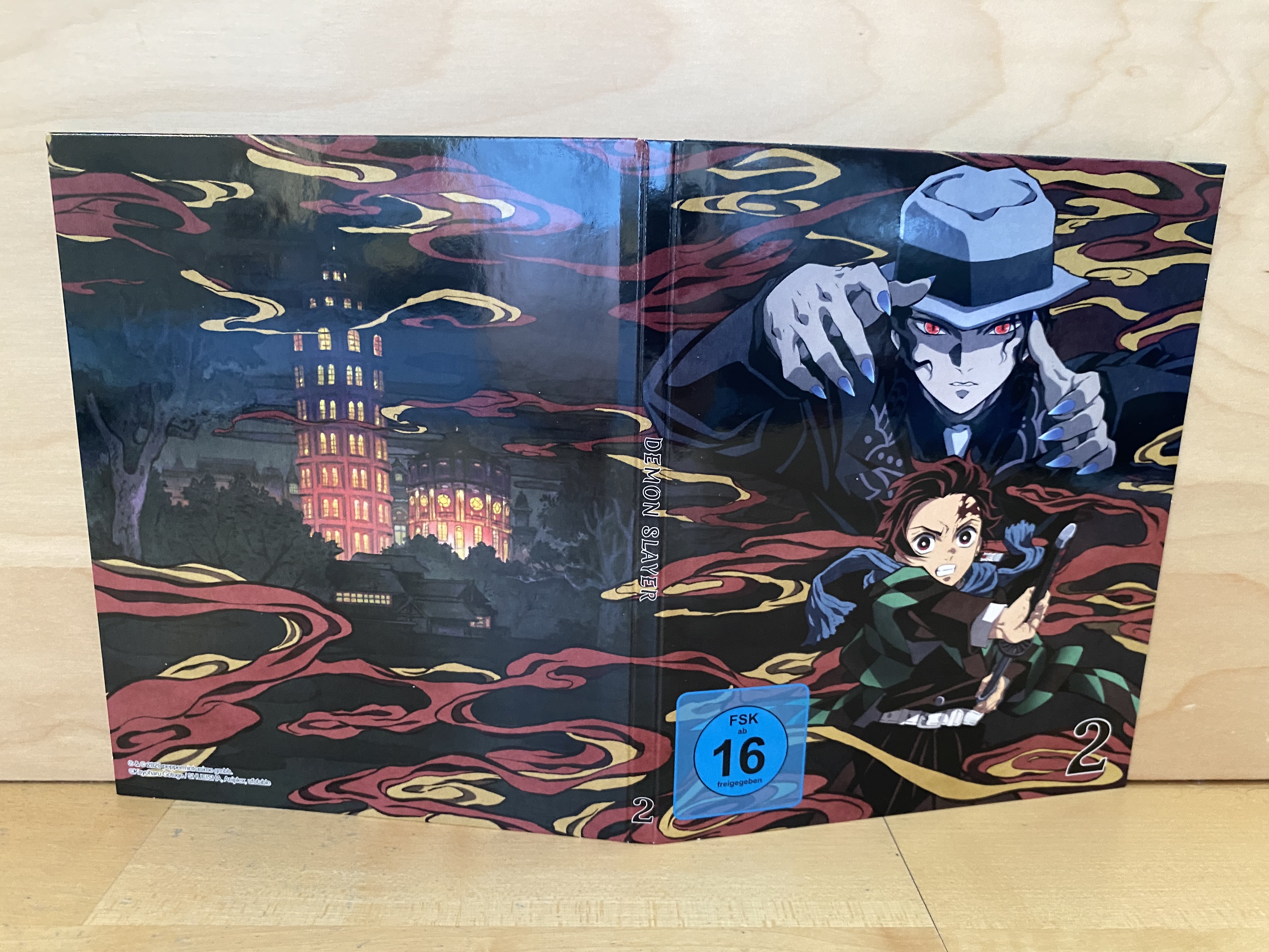 Wie das Vorgängervolume kommt auch Volume 2 der Serie wieder im Digipack mit eigenem Pappschuber daher. Letzterer ist erneut von ausreichender Stabilität, sollte jedoch natürlich pfleglich behandelt werden. Das FSK-Logo auch dem Schuber, der auf der Front diesmal Tanjiros Schwester Nezuko zeigt, ist wieder nur aufgeklebt und lässt sich vorsichtig ohne Rückstände oder Beschädigungen entfernen. Auf dem Digipack, auf dem Muzan Kibutsuji und Tanjiro zu sehen sind, ist das FSK-Kennzeichen jedoch wieder aufgedruckt.