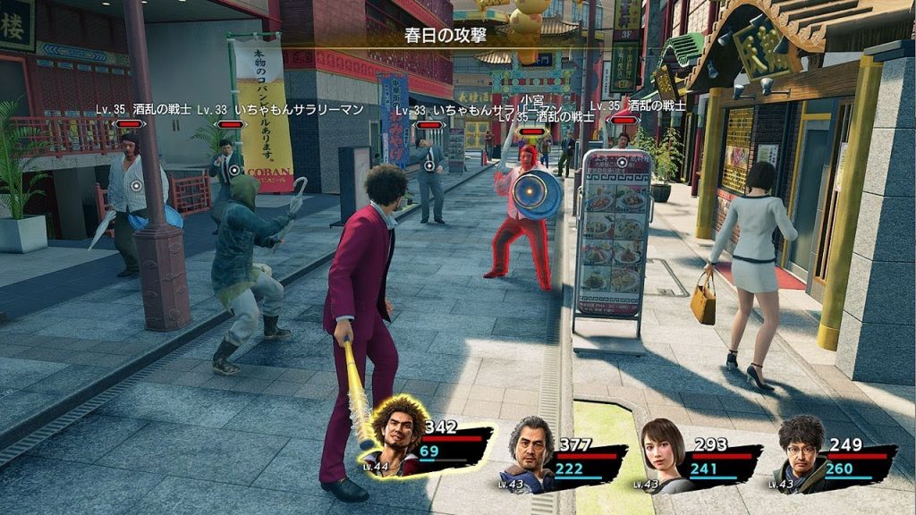 Das Kampfsystem von „Yakuza: Like a Dragon“ ist rundenbasiert. Neben den Standardattacken, die per einfachen Knopfdruck ausgeführt werden können, stehen uns auch sehr ansehnliche Spezialattacken zur Verfügung. Das Besondere: Während des Kampfgeschehens können wir Gegenstände wie Pylonen, Tische, Fahrräder, Werbetafeln oder Mopeds als ,,Waffen“ hinzuziehen. Insgesamt wirkt das Kämpfen sehr flüssig und dynamisch, sodass es hier nichts zu bemängeln gibt. Geführt werden die Kämpfe nicht nur alleine, denn begleitet werden wir von Mitstreitern, die wir im Laufe der Geschichte kennenlernen.