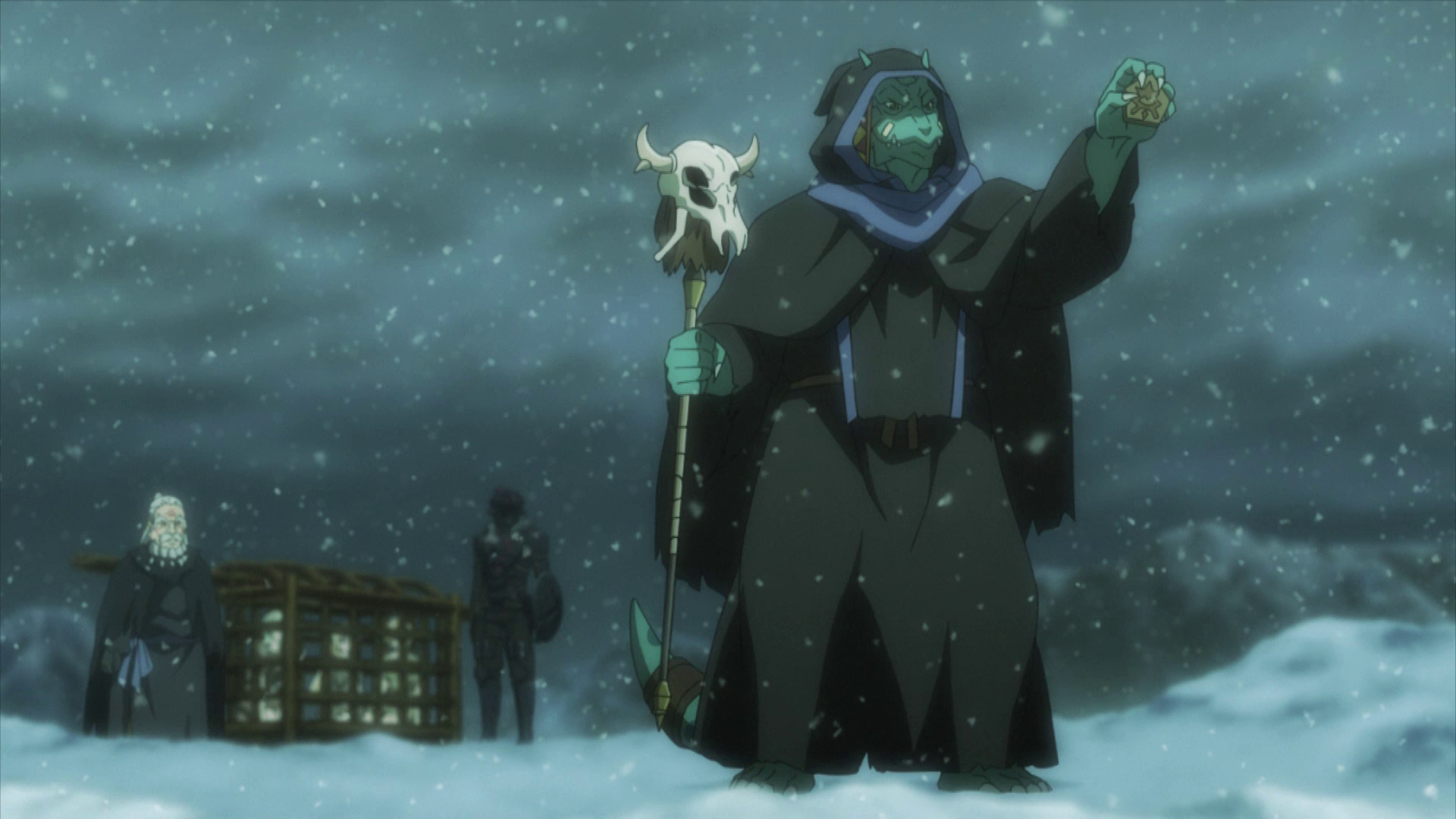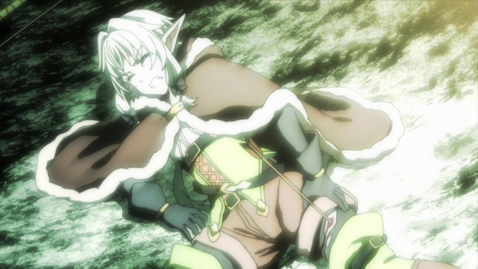 Tatsächlich treffen unsere Abenteurer bei ihrer Ankunft im Bergdorf direkt auf eine größere Gruppe der Monster, die einige der Dorfbewohner gar als Geiseln genommen und in der Mitte des Dorfes versammelt hat. Für Goblin Slayer und seine Truppe sind die Biester aber kein Problem, so dass es ihnen gelingt, allen 20 Goblins den Garaus zu machen. Nachdem sie die Verletzten notdürftig verarztet haben und sich die wichtigsten Informationen vom Dorfvorsteher mitteilen lassen haben, legen die Abenteurer eine kurze Pause ein, bevor sie sich zu einer Höhle in den Bergen aufmachen, die den Goblins vermutlich als Versteck dient. Dort angekommen lassen sich Spuren erkennen, die darauf hindeuten, dass die Abenteurergruppe, die sich vor ihnen an der Auslöschung der Monster versucht hat, eine Aushungerungstaktik anwenden wollte, was jedoch schief gegangen ist. In einem Rückblick erfährt der Zuschauer, dass die Vorräte der Gruppe in Sachen Brennholz und Nahrungsmitteln zu Neige gingen und die edle Schwertkämpferin – die junge Abenteurerin, die Goblin Slayer und Co. suchen sollen – von ihren Kameraden dazu verdonnert wurde, im Dorf nach Nachschub zu fragen, da sie sich den Aushungerungsplan ausgedacht hatte. Als sie jedoch mit fast leeren Händen Richtung Lager zurückmarschierte, wurde sie von Goblins attackiert, die zuvor die restlichen Mitglieder ihrer Abenteurergruppe getötet hatten.