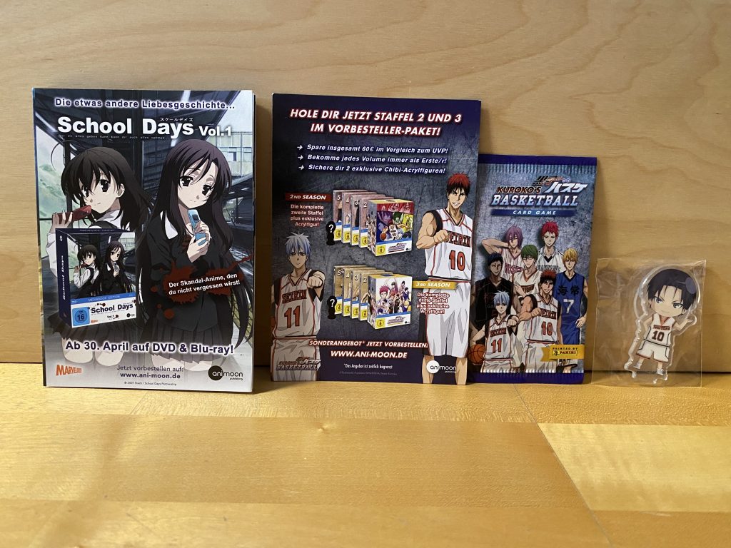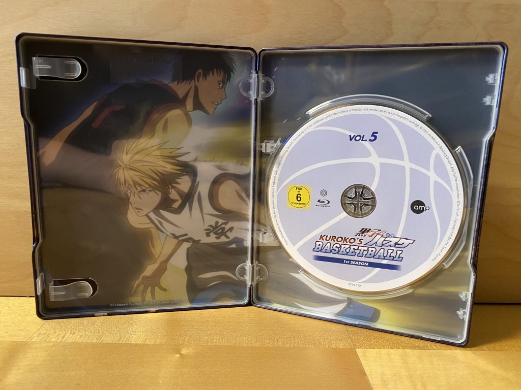 Kommen wir zur physischen Gestaltung des Produkts, die wieder einmal keinen Einfluss auf unsere Review-Gesamtwertung hat. Stattdessen soll euch der Überblick einen Eindruck davon vermitteln, was ihr bei einem Kauf des Volumes erwarten dürft. Die Bilder und Informationen beziehen sich dabei auf die limitierte Steelcase-Edition des fünften Volumes der ersten Staffel von „Kuroko’s Basketball“ in der Blu-Ray-Variante.