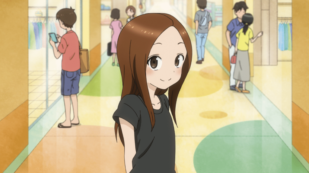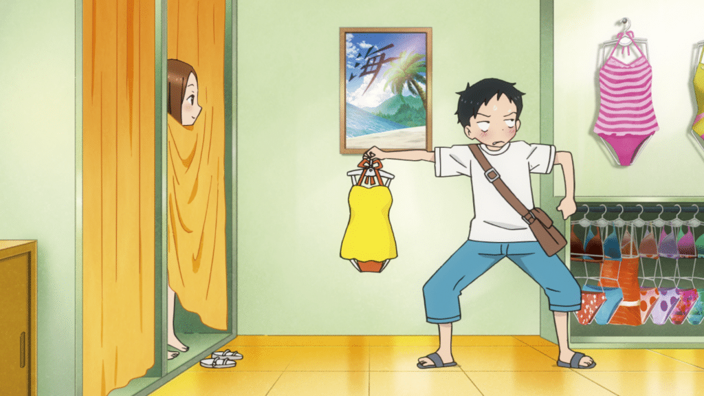Ein andermal treffen sich die beiden zufällig im Shopping-Center. Dabei bemerkt Takagi-san Nishikata, als dieser gerade den Buchladen verlässt, in dem er sich den neuesten Manga-Band der Shojo-Reihe „100% unglücklich verliebt“ gekauft hat. Da ihm das peinlich ist, versucht er das natürlich vor Takagi-san zu verheimlichen, doch diese hat ihn natürlich wieder durchschaut, da sie ja bereits weiß, dass Nishikata die Geschichte mag. Auch ein Bluff seinerseits fliegt sofort auf, sodass er bei einem Ratespiel gegen seine Klassenkameradin den Kürzeren zieht und nun machen muss, was diese ihm sagt. Das kommt Takagi-san gerade recht, denn sie hat von ihrer Mutter Geld bekommen, um sich einen neuen Badeanzug zu kaufen. Dazu schleppt sie Nishikata kurzerhand mit, der ihr seine Meinung zu den verschiedenen Badeanzügen mitteilen soll, was diesem aber sichtlich unangenehm ist. Da hilft es auch nicht, dass plötzlich Kouki Nakai und seine Freundin Mano, beides Klassenkameraden von Nishikata und Takagi-san, im Geschäft auftauchen.