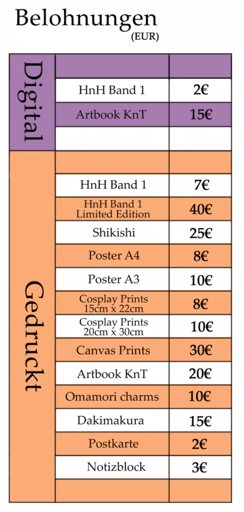 Wenn ihr die Kampagne unterstützt, dann habt ihr – ganz typisch für Kickstarter-Projekte – natürlich auch bei „Hoshi no houseki – Sternenjuwel“ die Möglichkeit verschiedene Belohnungen zu erhalten. Dabei gibt es jedoch keine festen Belohnungsstufen. Stattdessen hat jede Belohnung ihren eigenen Preis. Solltet ihr es auf mehrere Belohnungen abgesehen haben, addiert ihr einfach deren Preise, um auf den den Betrag zu kommen, mit dem ihr die Kampagne unterstützen müsst, um die entsprechenden Rewards zu erhalten. Sobald die Kampagne beendet ist, erhaltet ihr dann nämlich ein Formular, in dem ihr angebt, welche Belohnungen ihr euch aussuchen wollt, für die ihr auf Kickstarter gezahlt habt. Folgende Belohnungen sind generell verfügbar: