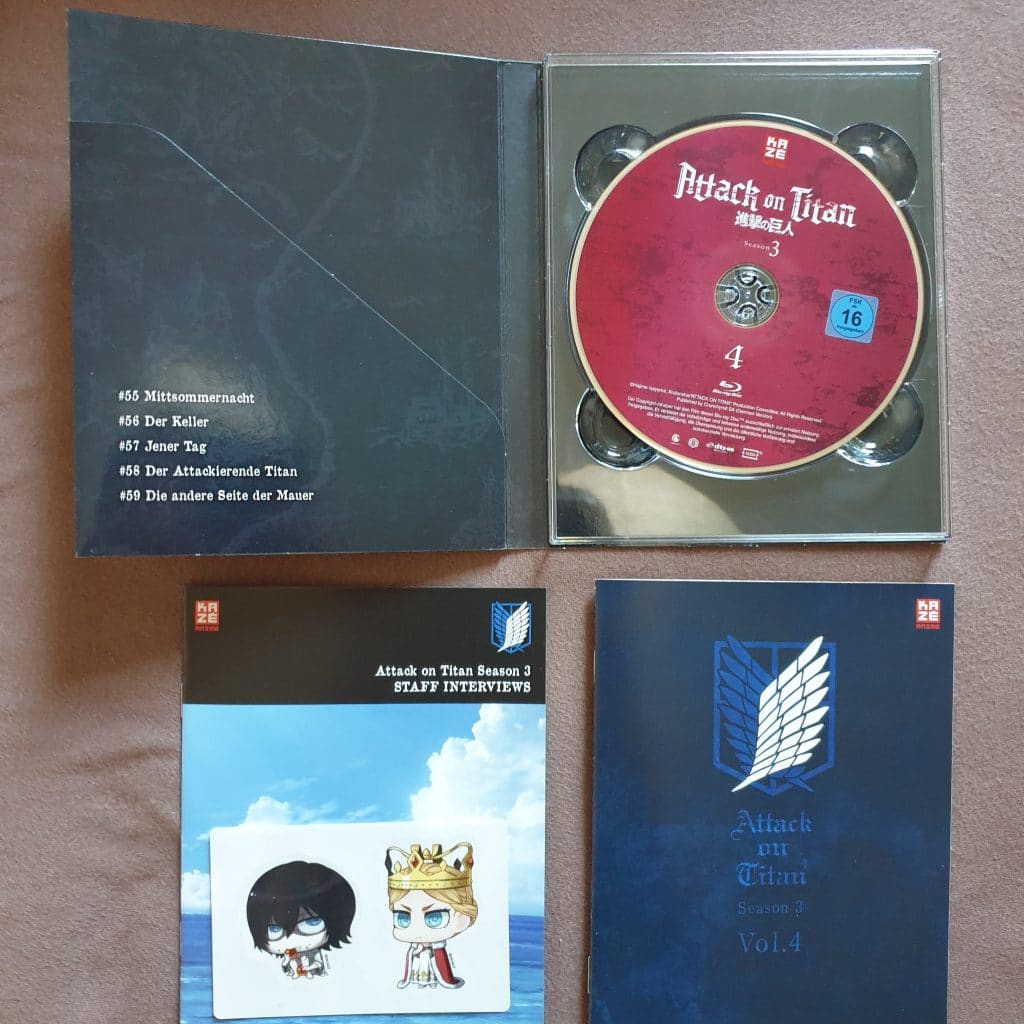 Wie ihr es bereits kennt: Die physische Umsetzung des Produkts ist natürlich wieder kein wertungsrelevanter Punkt unserer Kritik, soll euch aber ein Bild vom dem vermitteln, was ihr als Käufer erwarten könnt. Die folgende Beschreibung und die Bilder beziehen sich dabei auf die limitierte Blu-Ray-Version des vierten Volumes der dritten Staffel von „Attack on Titan“.