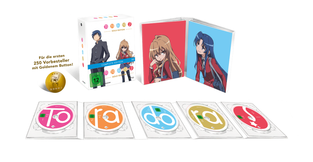 Diese Komplettbox wird voraussichtlich bereits am 09. Juli 2021 im Handel erscheinen und alle 25 Episoden von „Toradora!“ plus OVA-Episode enthalten. Dabei dürfen sich Käufer auf ein aufklappbares Digipack im Schuber freuen, das zum Preis von 89,99 € als Blu-Ray und DVD angeboten wird. Wer im AniMoon Shop zu den ersten 250 Bestellern zählt, der erhält als exklusives Extra einen Goldenen Button mit „Toradora!“-Motiv dazu. Sobald diese Version der Serie auch bei Amazon verfügbar ist, informieren wir euch wie gewohnt noch einmal gesondert.